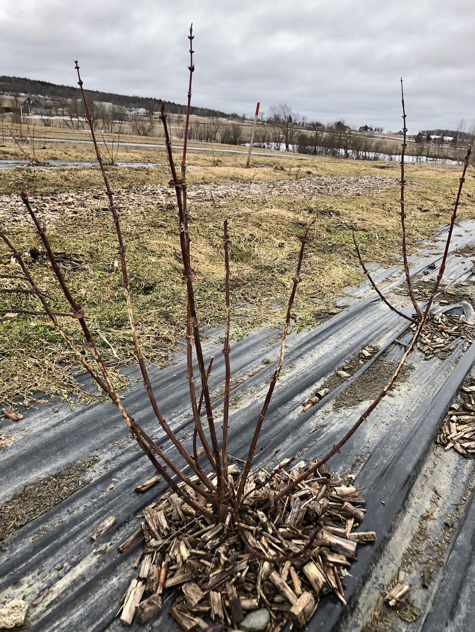 Dommages de campagnol sur les tiges d'un camérisier.