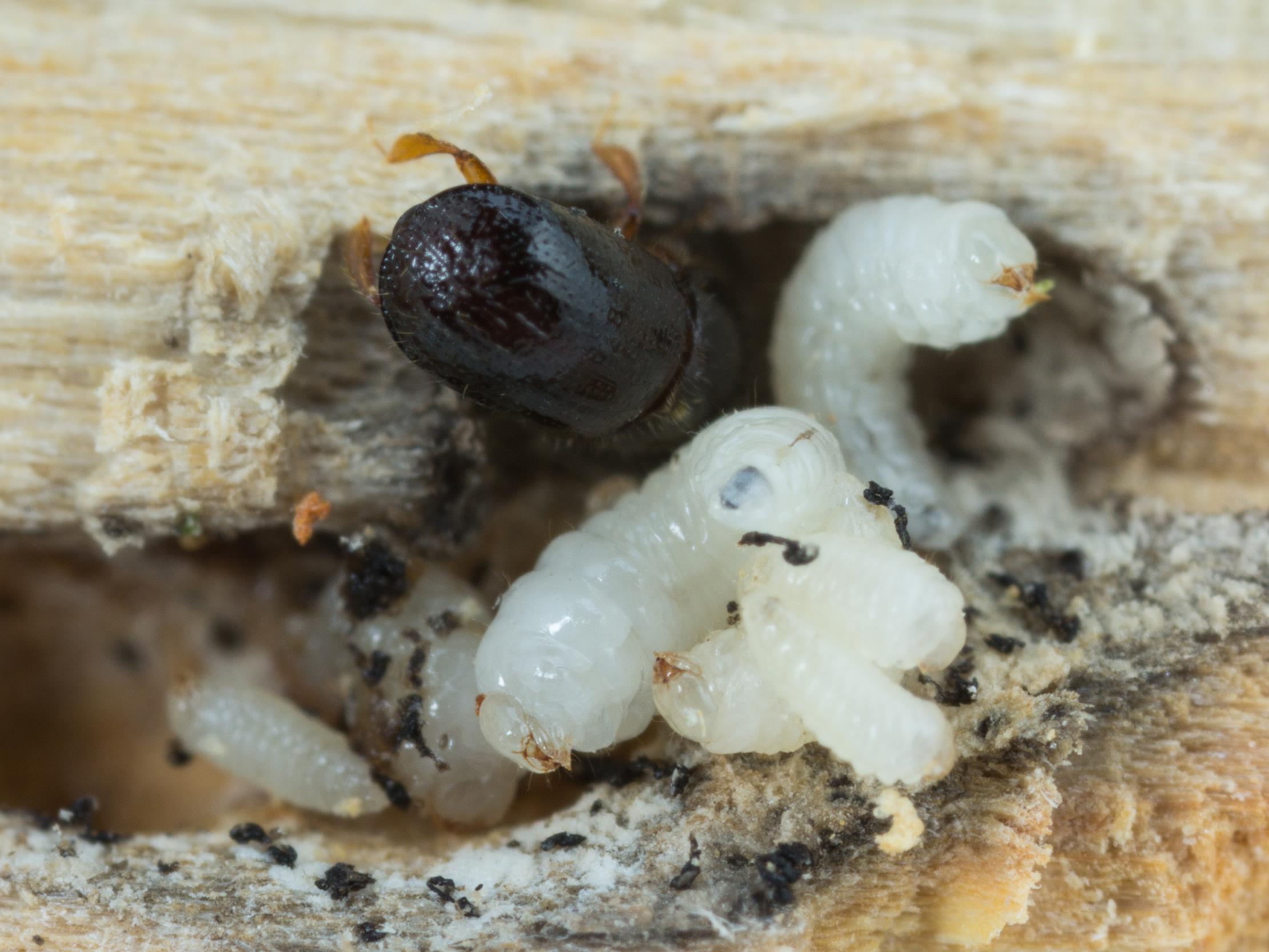 Larves avec un adulte dans une galerie