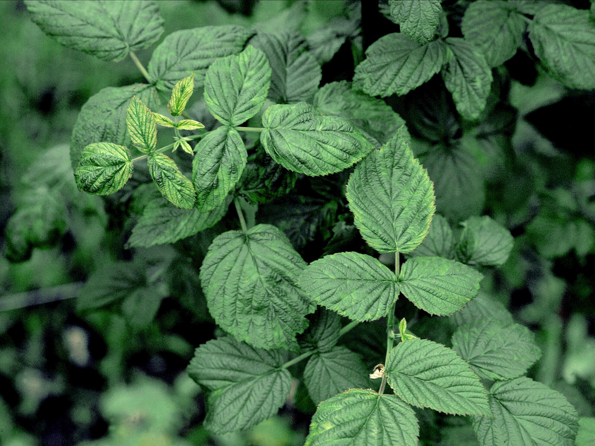 Sur des feuilles de framboisier, présence d’une malformation du limbe et d’une mosaïque vert pâle à jaune. Ces symptômes sont caractéristiques d’une maladie virale dont la nature du virus n’a pu être précisée.