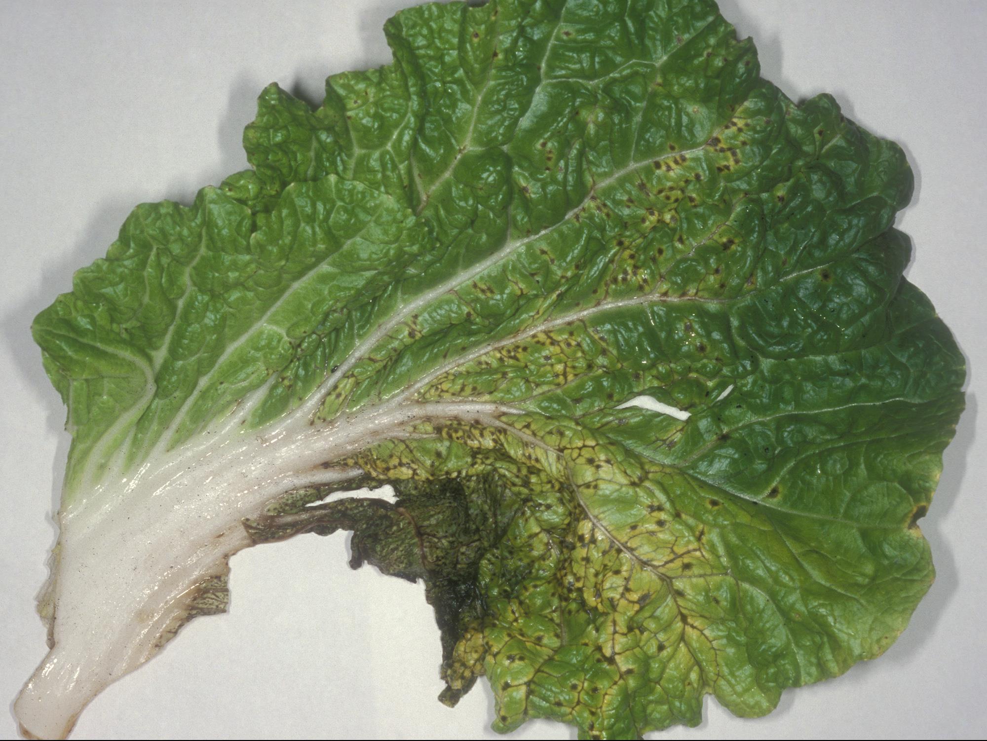 Sur une feuille de chou chinois provenant d’un champ, présence de très petites taches grisâtres à noires et d’un jaunissement diffus localisés entre ou près des nervures. La feuille est également bosselée. Les tests de laboratoire ont révélé la présence d’un Potyvirus.