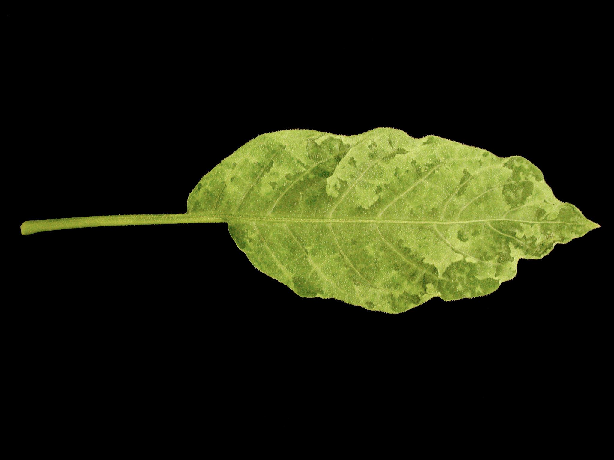 Face supérieure d’une feuille de brugmansia en arbre (cv 'Knightii'). Présence de sévères mosaïques vert pâle à vert foncé, distribuées au hasard sur le limbe. La marge des feuilles est également déformée. Les tests de laboratoire ont révélé la présence d’un virus appartenant au groupe des Potyvirus. La conseillère agricole mentionne que tous les plants de ce cultivar sont affectés.