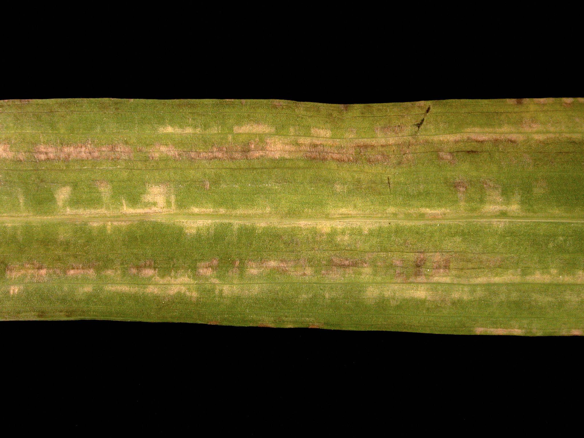 À la face supérieure d’une feuille de freesia, présence d’une sévère mosaïque vert pâle à vert foncé, parfois teintée de brun. Tous les niveaux de feuilles sont touchés. Les tests de laboratoire ont révélé la présence d’un virus appartenant au groupe des Potyvirus. Cet échantillon provient d’une serre expérimentale dont 80 % des plants, sur 50 pieds carrés (4,65 mètres carrés), sont affectés.
