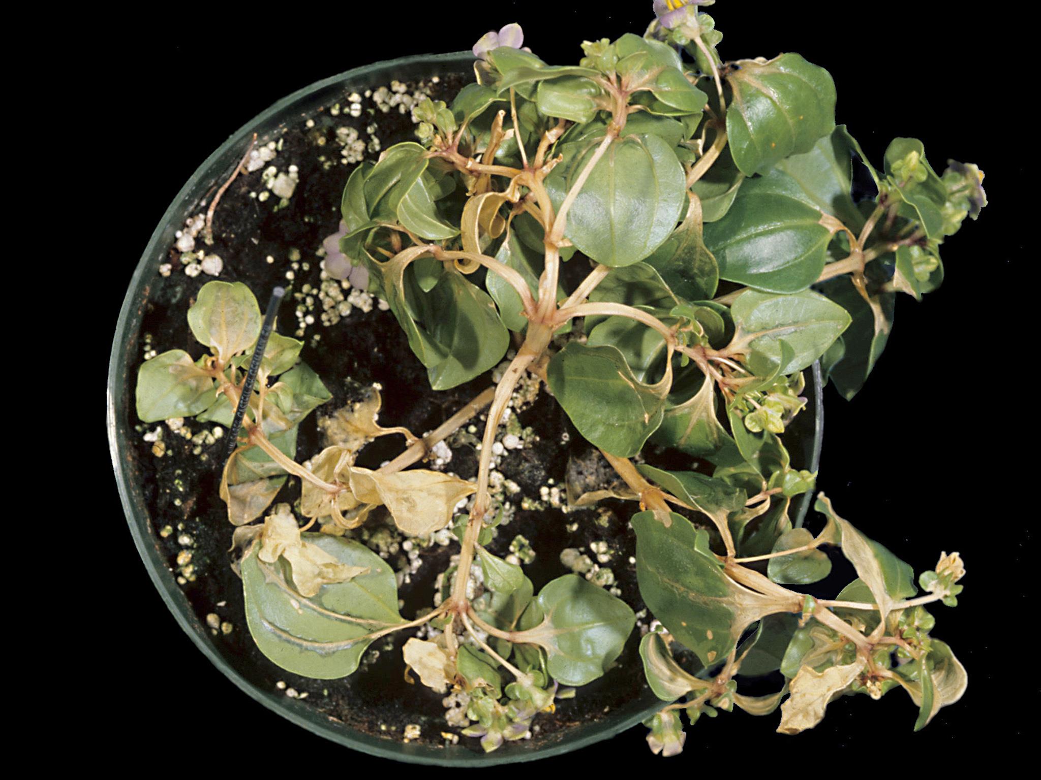 Une vue aérienne d’un plant d’exacum provenant d’une serre montre des sections de tige et des feuilles beiges, sèches et flétries. Les taches débutent à la base du limbe, par le pétiole. Les tests de laboratoire ont révélé la présence du virus de la maladie bronzée de la tomate (TSWV).