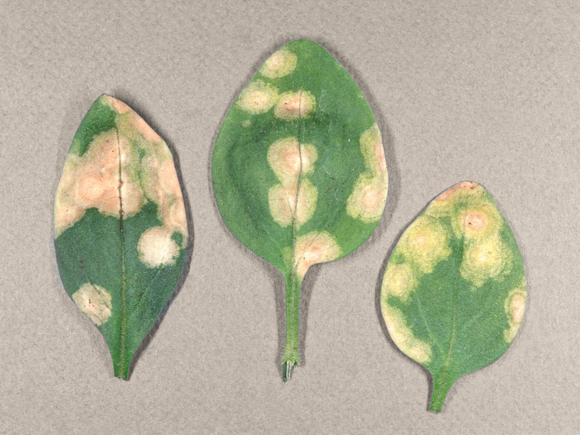 Des feuilles de muflier montrent des taches circulaires ayant une teinte beige à rose. Ces taches peuvent occuper plus de la moitié de la surface du limbe. Une légère bordure jaune est également présente à la marge des taches. Les tests de laboratoire ont révélé la présence du virus de la tache nécrotique de l'impatiente (INSV).