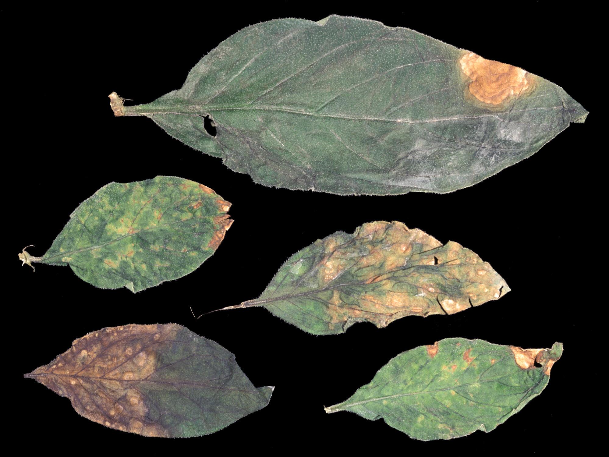 Des feuilles de bouvardia montrent une mosaïque associée à des brûlures beiges à brunes. Les tiges présentaient des taches brun rougeâtre ou un brunissement régulier de l’épiderme (non visible ici). Les tests de laboratoire ont révélé la présence du virus de la tache nécrotique de l'impatiente (INSV).