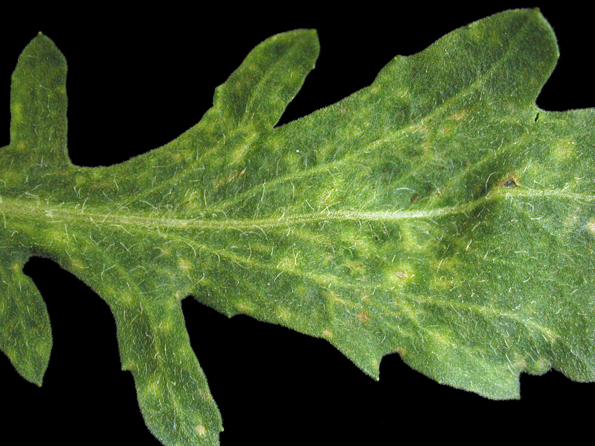 Une vue rapprochée d’une feuille de gaillarde montre de petites taches circulaires jaunes. Le diamètre des taches est d’environ 1 mm. Elles sont réparties au hasard sur le limbe. Tous les niveaux de feuille sont atteints. Les tests de laboratoire ont révélé la présence du virus de la tache nécrotique de l'impatiente (INSV).