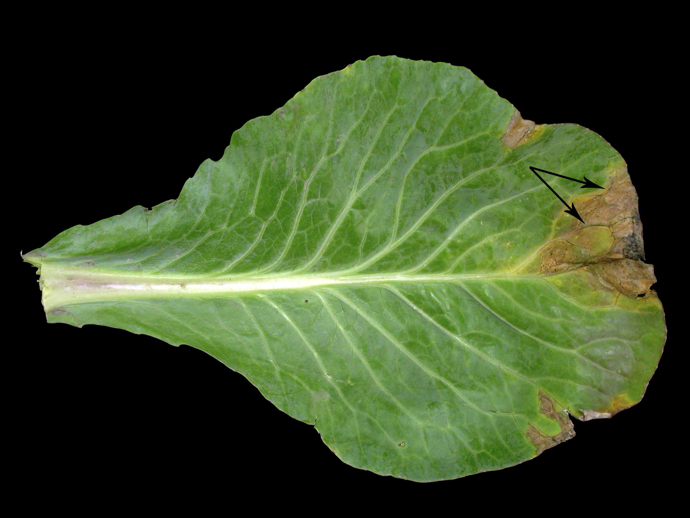 Sur une feuille de chou pommé provenant d’un champ, présence de brûlures brunes en forme de « V » débutant à la marge. Les nervures sont noires (voir flèches). Les tests de laboratoire et de pouvoir pathogène sur des plantules de chou ont révélé la présence de la bactérie Xanthomonas campestris pv. campestris, responsable de la nervation noire.