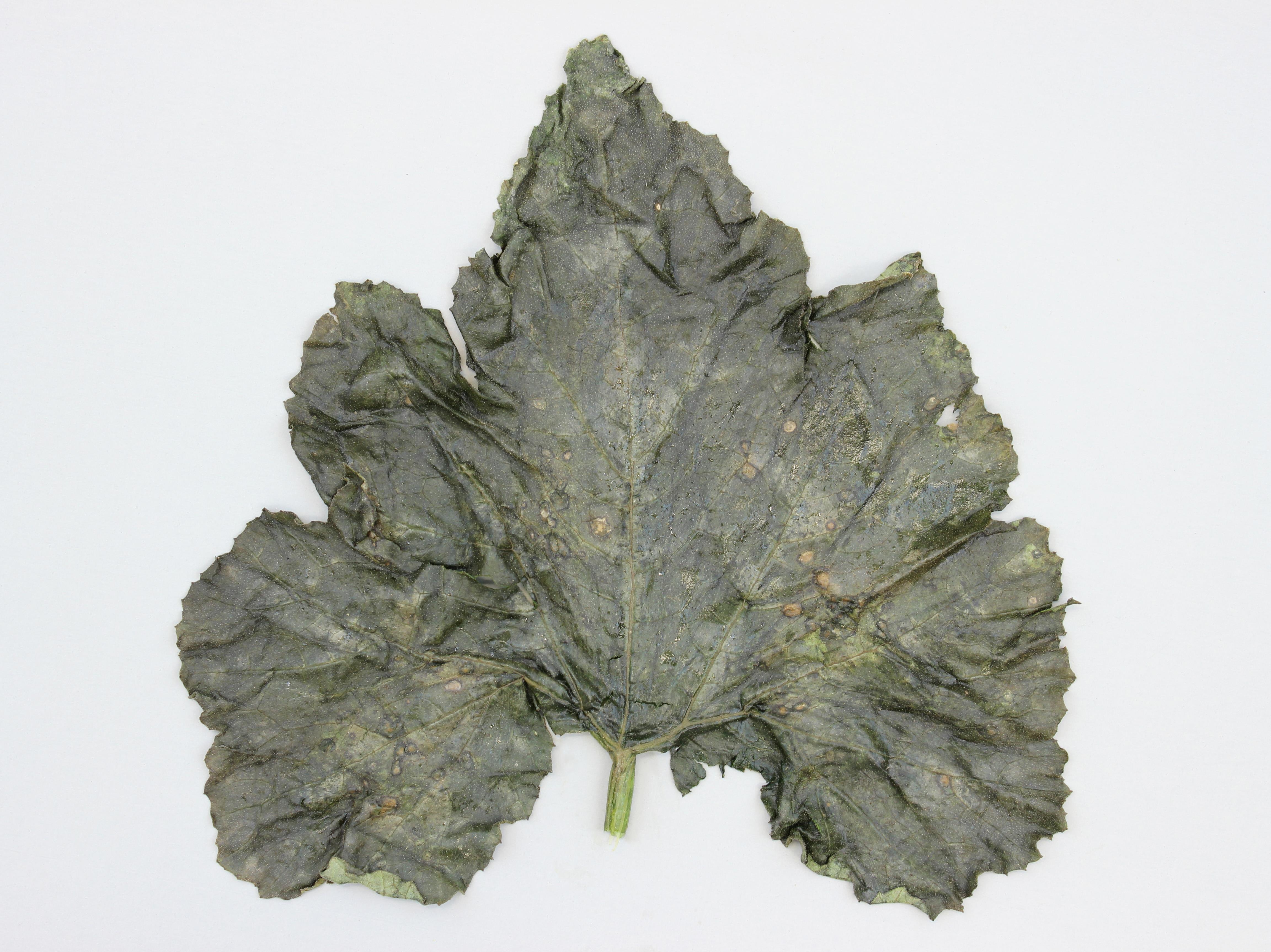 À la face supérieure d'une feuille basale de courgette provenant d’un champ, présence de taches brunes à contour foncé, plutôt rondes, mais angulaires lorsqu’elles sont accolées aux nervures. Elles sont distribuées au hasard sur le limbe. Les tests de laboratoire ont révélé la présence de la bactérie Pseudomonas syringae, responsable de la tache angulaire.