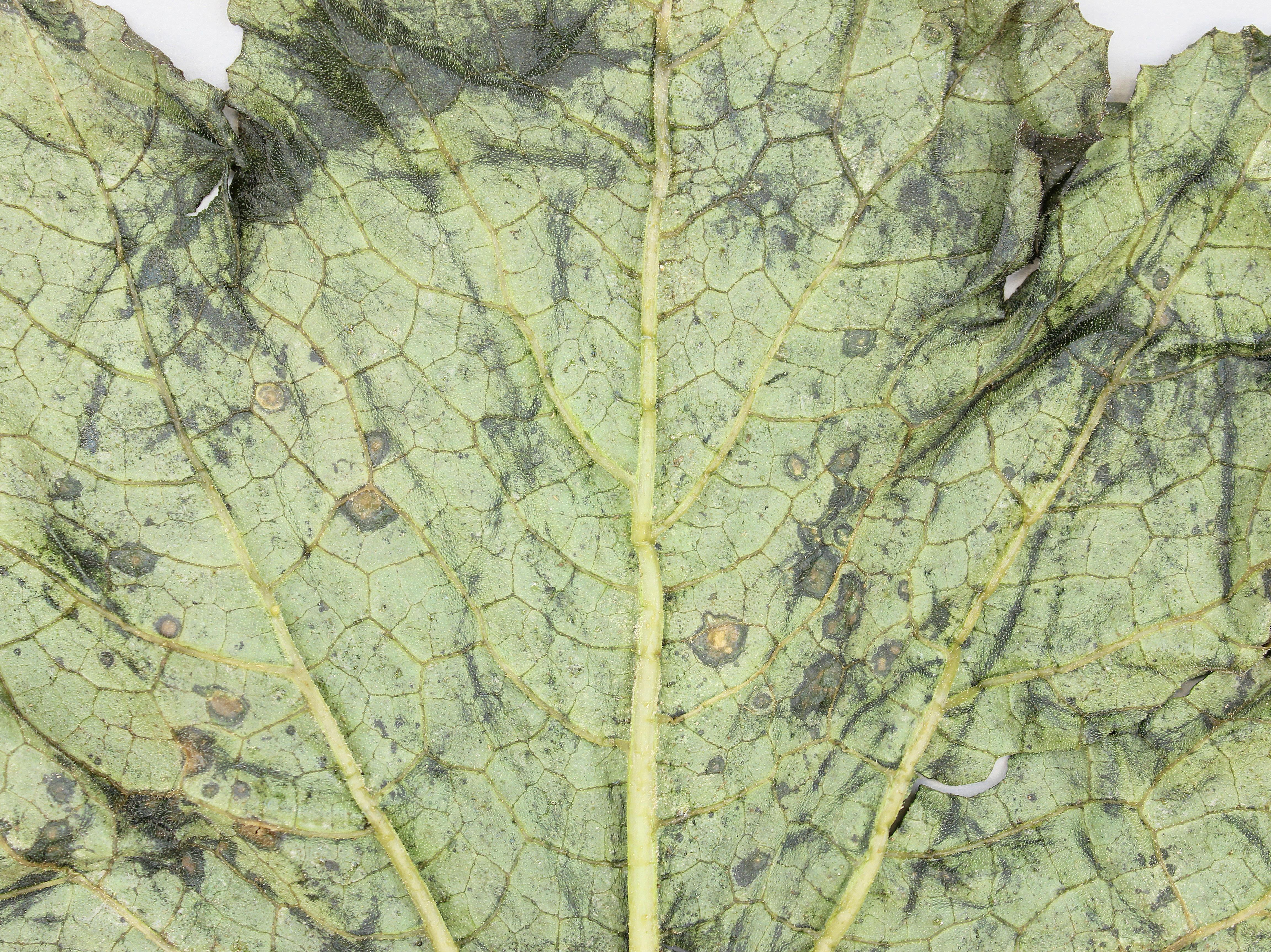 À la face inférieure d'une feuille basale de courgette provenant d’un champ, présence de taches brunes à contour foncé, plutôt rondes, mais angulaires lorsqu’elles sont accolées aux nervures. Elles sont distribuées au hasard sur le limbe. Les tests de laboratoire ont révélé la présence de la bactérie Pseudomonas syringae, responsable de la tache angulaire.