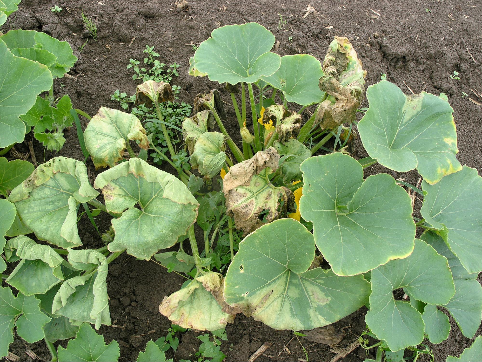 Ces feuilles de courge montrent du jaunissement et des brûlures brunes en forme de « V » entre les nervures secondaires. Les feuilles flétrissent et la marge s’enroule. Le test de biologie moléculaire (PCR) a révélé la présence de la bactérie Erwinia tracheiphila, responsable du flétrissement bactérien chez les cucurbitacées.