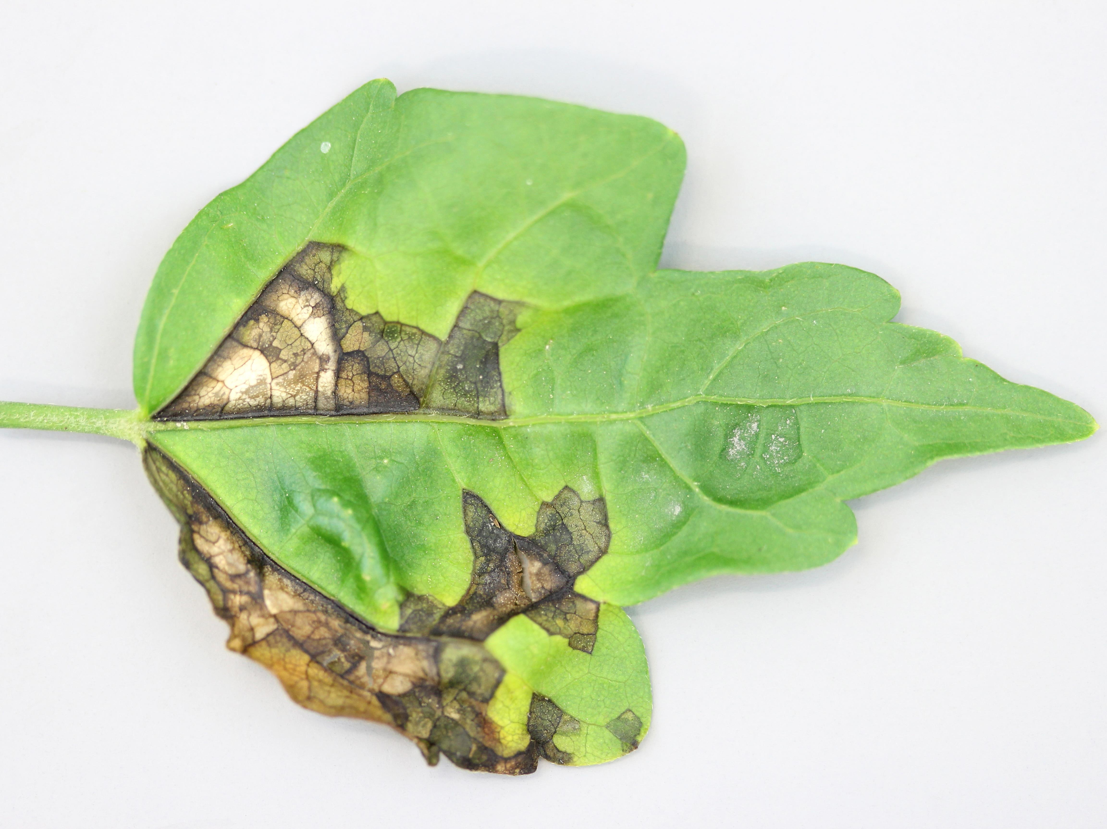 Une feuille d’hibiscus provenant d’un plant cultivé en pépinière montre des taches angulaires brunes, délimitées par une marge foncée, d’une dimension variable. Certaines taches ont un centre beige. Les tests de laboratoire ont révélé la présence de la bactérie Pseudomonas syringae, responsable de la tache bactérienne. Chez l’hibiscus, P. syringae pv. hibisci est rapporté.