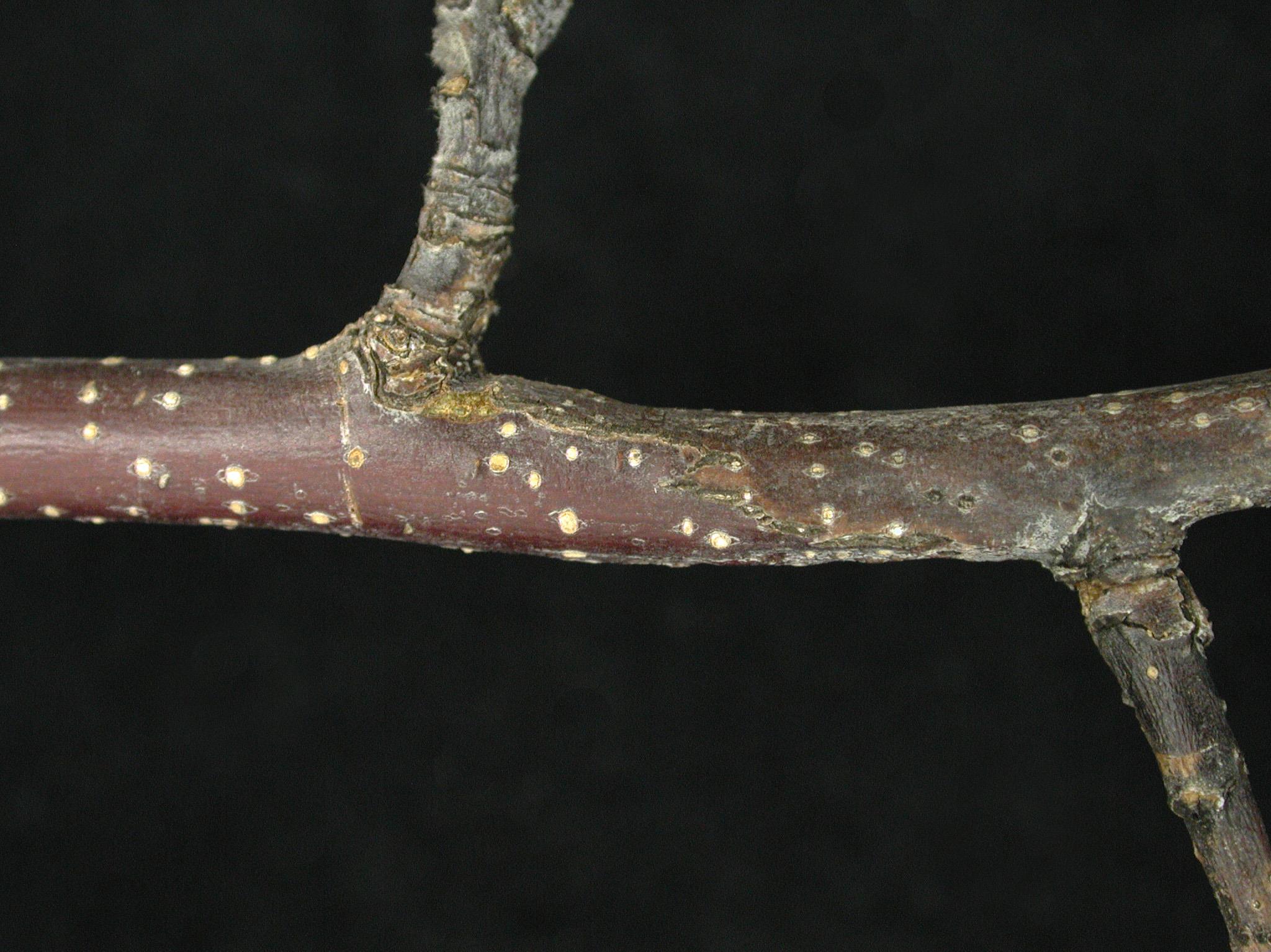 Chancre fendu sur branche de pommier