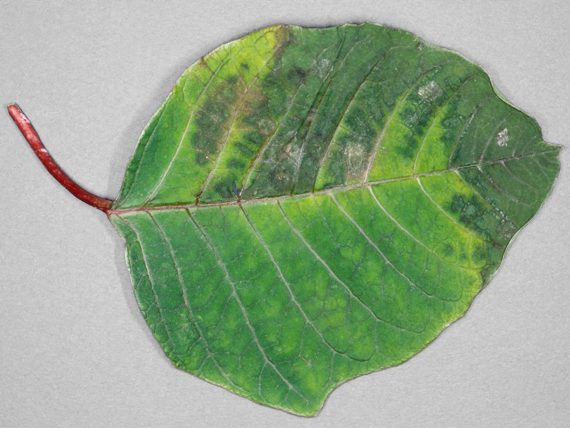 La feuille d’un poinsettia cultivé en serre montre la progression du jaunissement sur le limbe. Les racines sont brunes et le cortex racinaire se détache facilement (non visible ici). Les tests de laboratoire ont révélé la présence de Pythium sp. dans les racines, un pH acide (5,5) et une conductivité électrique élevée du substrat (3,3 mS/cm). Les symptômes résultent probablement de la synergie de ces trois causes.