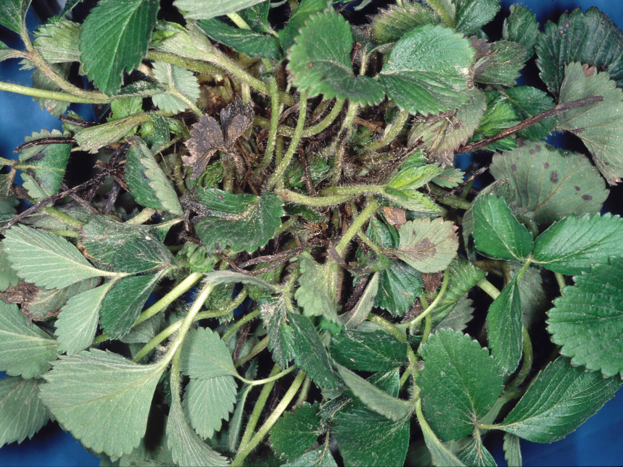 Le fraisier (cv 'Jewel') présente une importante malformation qui se caractérise par la présence de multiples collets accolés les uns sur les autres. Les feuilles sont nombreuses et petites. Ces symptômes sont caractéristiques de la maladie des collets multiples causée par un phytoplasme.
