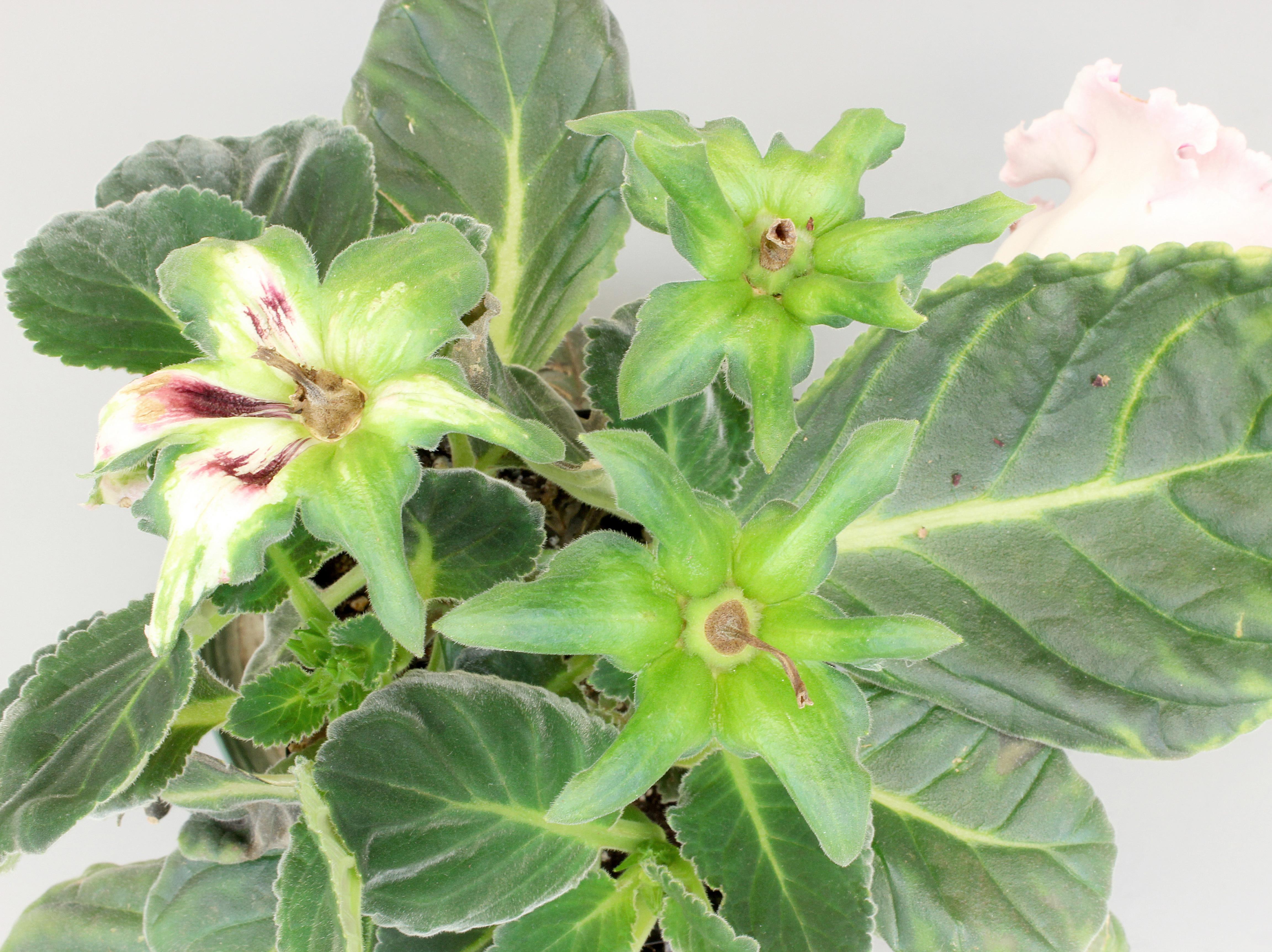 Une vue rapprochée d’un plant de gloxinia montre des sépales « pétaloïdes » c’est-à-dire des sépales qui ont pris la forme et la couleur des pétales. Les pédoncules sont gros et robustes. Les tests de laboratoire ont révélé la présence d'un phytoplasme et ce résultat a été conformé par le séquençage d'une partie de son génome. Il s’agit probablement du phytoplasme de la jaunisse de l’aster qui est rapporté chez le gloxinia.