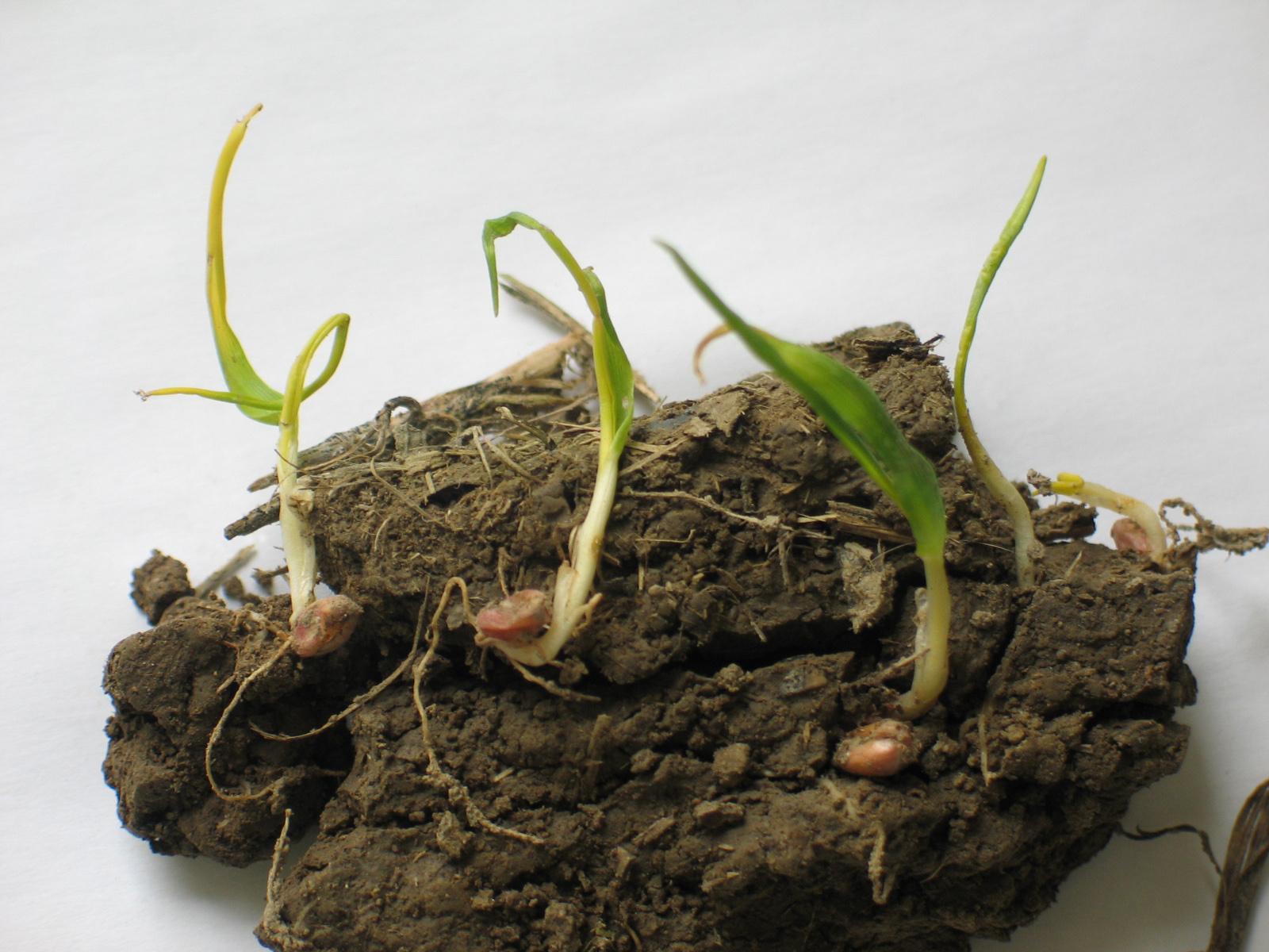 Un semis direct hâtif de blé de printemps montre du jaunissement et une déformation des nouvelles feuilles. Les plants ont eu une croissance difficile à la suite de basses températures de l'air (froid) et de fortes précipitations qui sont survenues à la suite du semis.