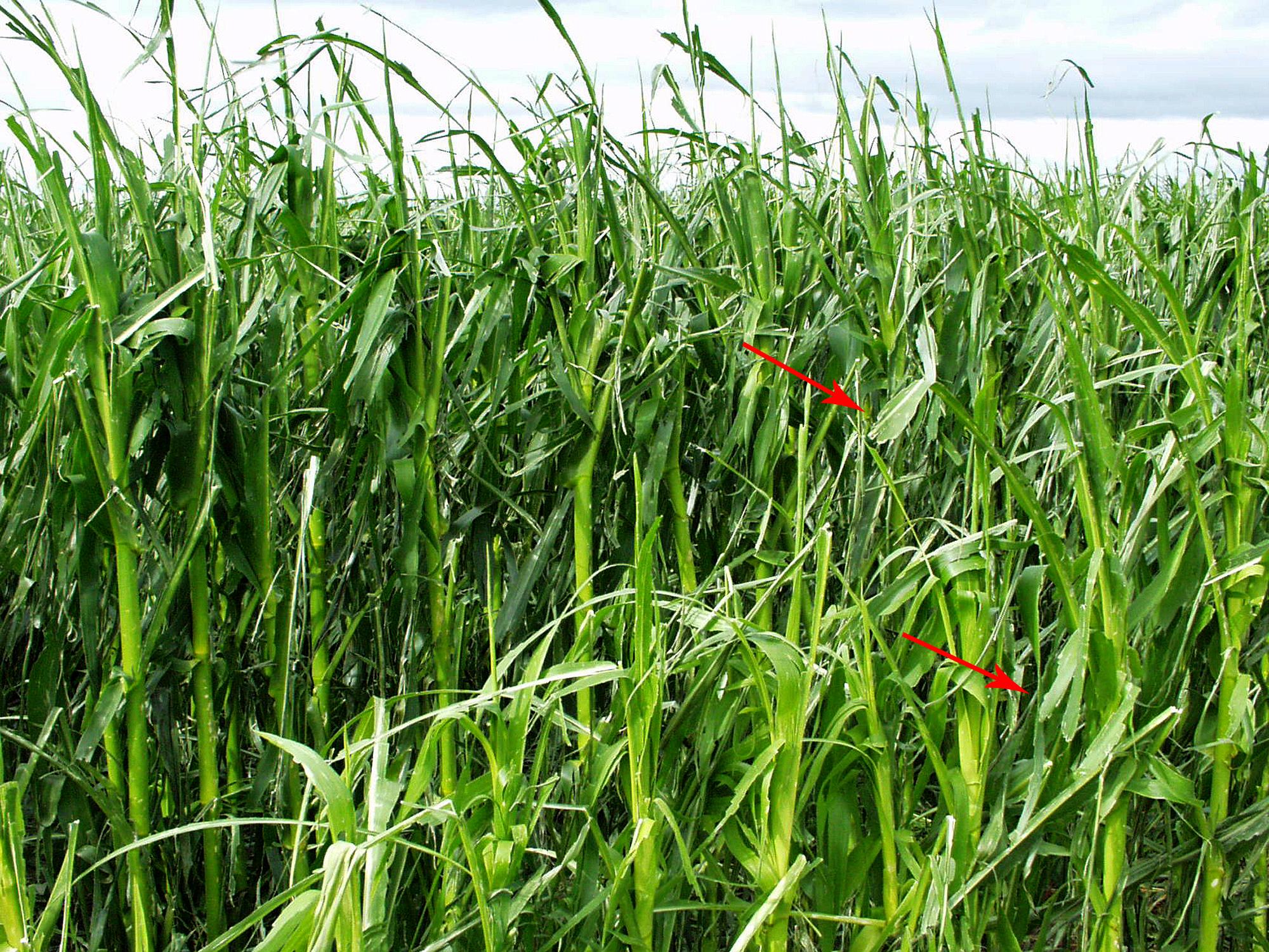 Le limbe de plusieurs feuilles de maïs grain et fourrager s’est déchiré (voir flèches) sous l’impact d’un gros épisode de grêle (juillet 2001). Tous les niveaux de feuilles ont été touchés. Les feuilles lacérées sont réparties aléatoirement dans le champ.