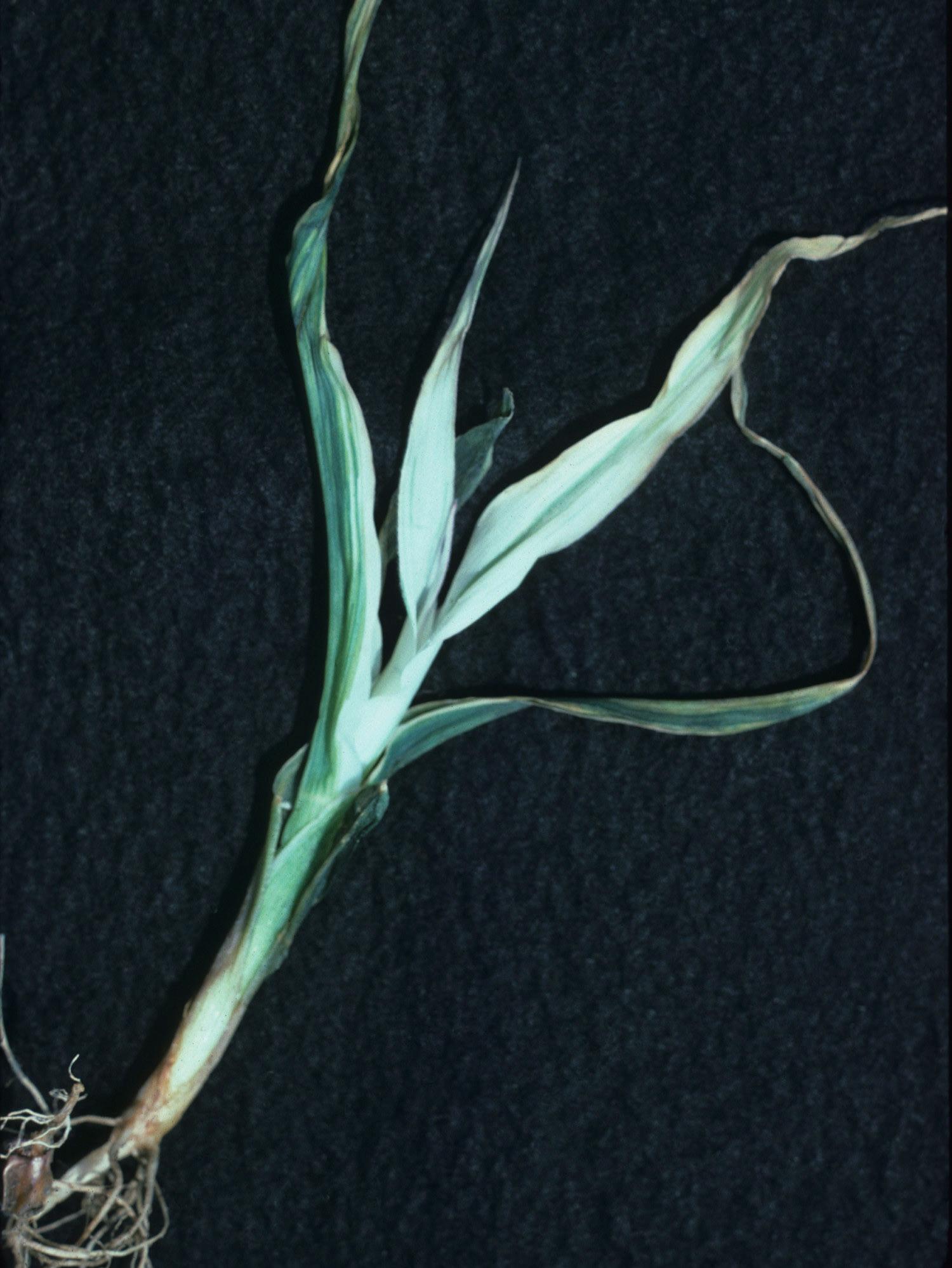 Sur un jeune plant de maïs grain et fourrager, les feuilles médianes et terminales prennent une coloration blanchâtre à argentée et seule la nervure centrale demeure verte. Ces symptômes sont caractéristiques de la carence en zinc chez le maïs grain et fourrager. Dans ce cas, la carence est sévère même si les plants sont jeunes.