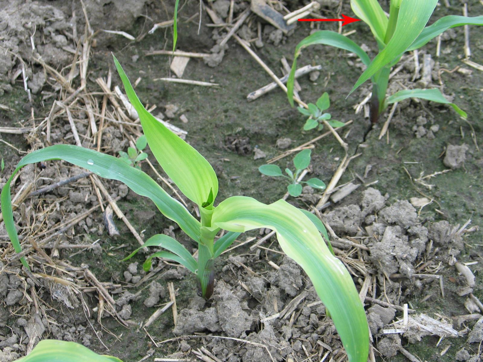 Sur un jeune plant de maïs grain et fourrager, les feuilles médianes montrent une large bande jaunâtre à blanchâtre de chaque côté de la nervure centrale qui demeure verte ou de petites bandes jaunes. Sur le plant en arrière-plan, on observe les mêmes symptômes (voir flèche). Ces symptômes sont caractéristiques de la carence en zinc chez le maïs grain et fourrager.