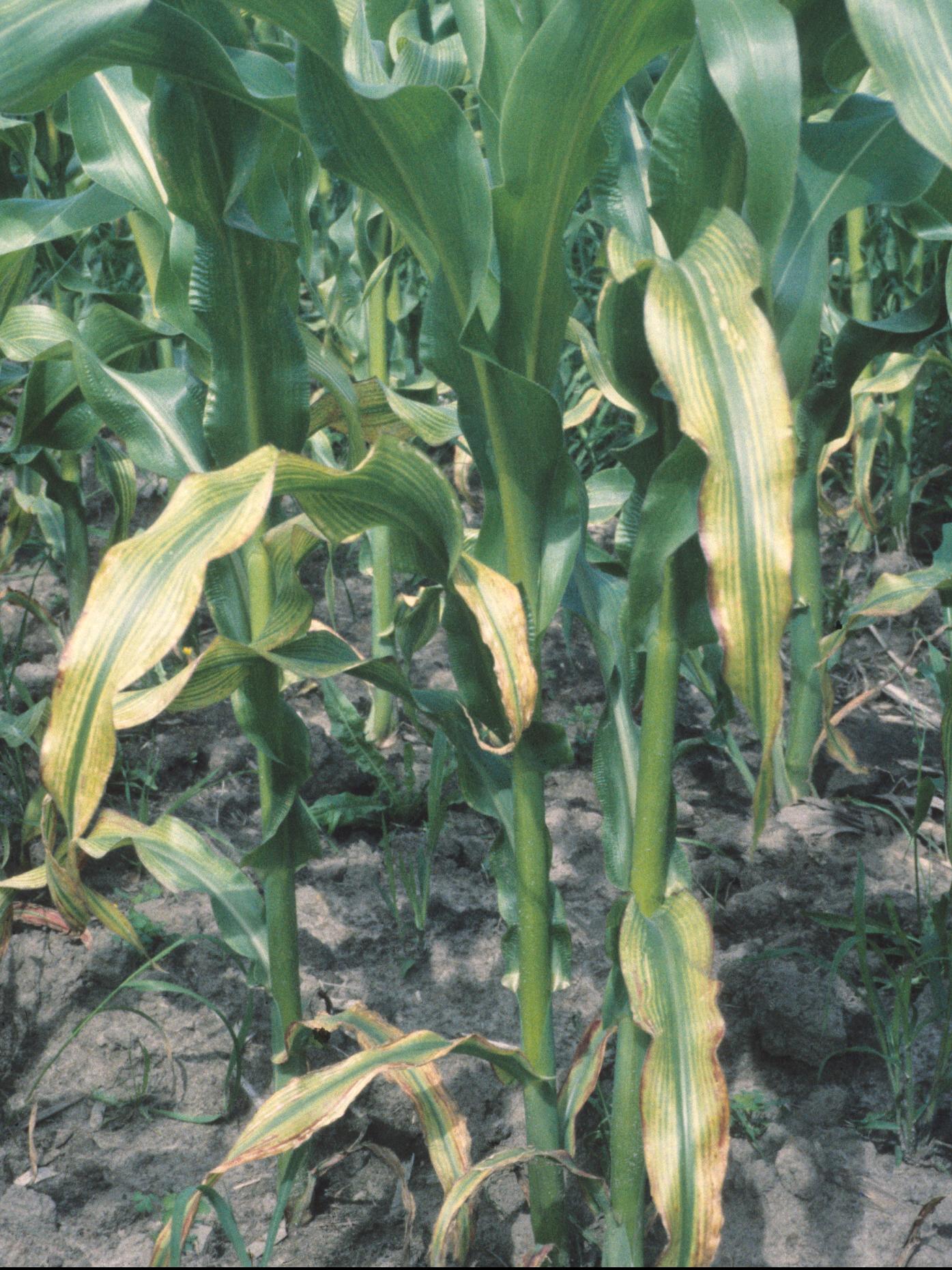Jaunissement entre les nervures vertes sur feuilles de maïs grain et fourrager