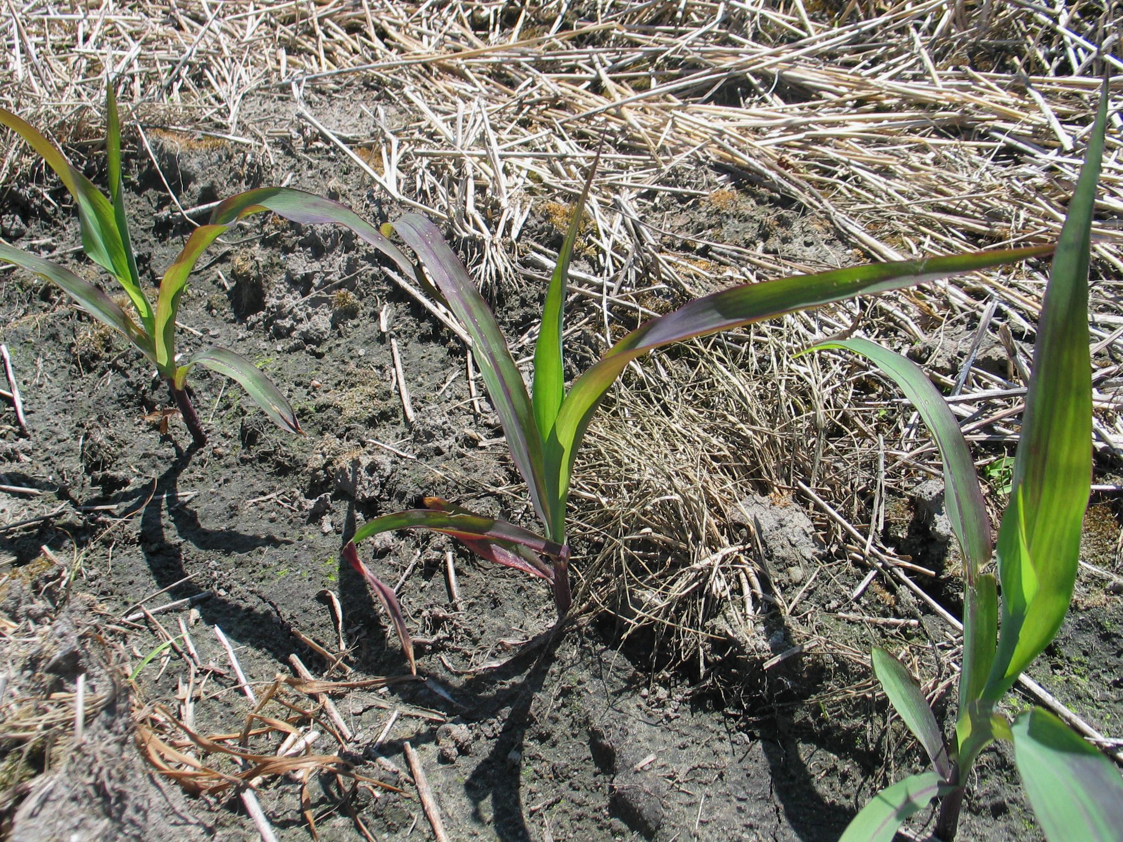 De jeunes plants de maïs grain et fourrager, au stade 4 à 5 feuilles, montrent différentes intensités de mauve sur les feuilles. Tous les niveaux de feuille sont touchés. Ce symptôme est caractéristique de basses températures de l'air (froid) en début de saison.