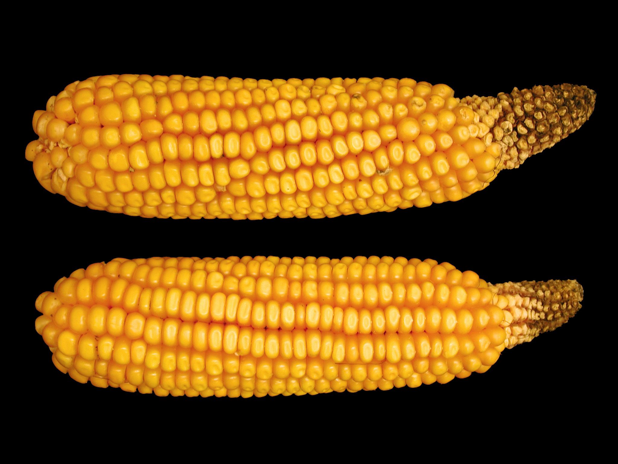 Deux épis de maïs grain et fourrager montrent un apex atrophié et brun. Les grains situés à l’extrémité des épis ne se sont pas ou peu développés. Ce symptôme est causé par une température élevée de l’air (chaleur) lors de la floraison. Chez le maïs, ce problème non parasitaire est connu sous le nom de stérilité apicale.