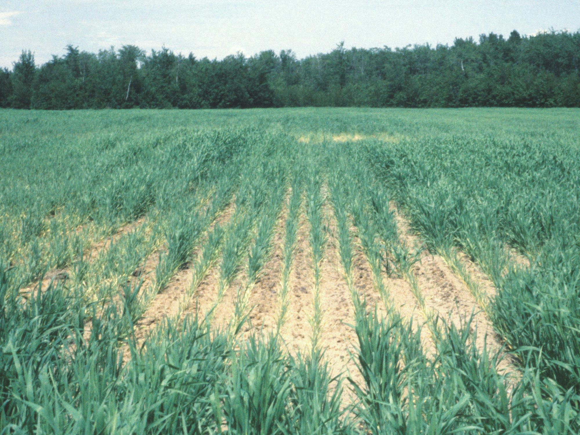 De grandes zones jaunes, réparties aléatoirement dans un champ d’orge, montrent des plants avec des feuilles basales jaunes et une variabilité dans la hauteur des plants sur un même rang. Le pH du sol est acide (