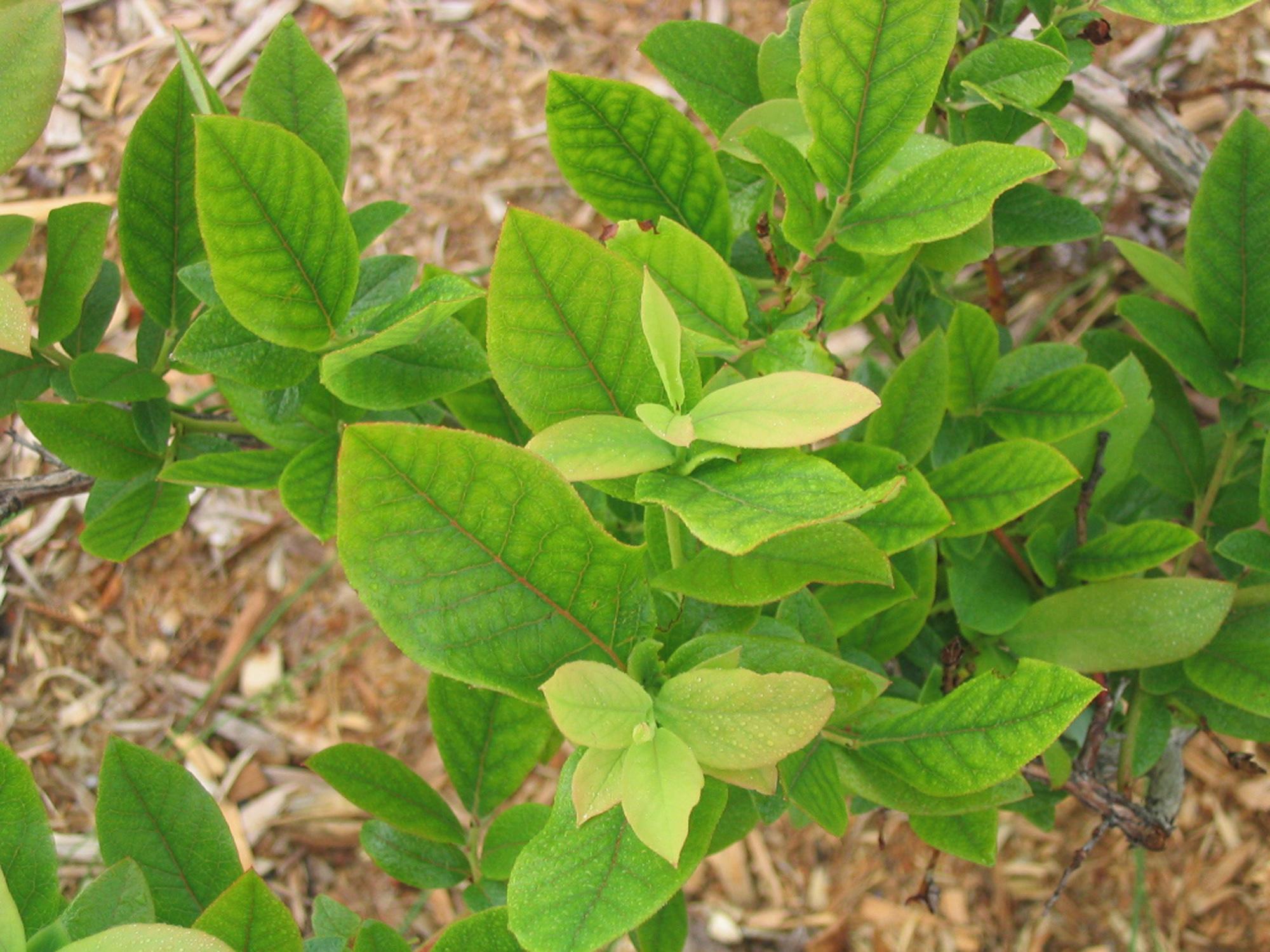 Sur ce plant de bleuet en corymbe, les jeunes feuilles sont jaunes à rose orangé. Les feuilles médianes et basales montrent un jaunissement entre les nervures qui demeurent vertes. Ces symptômes sont caractéristiques d'une carence en fer.