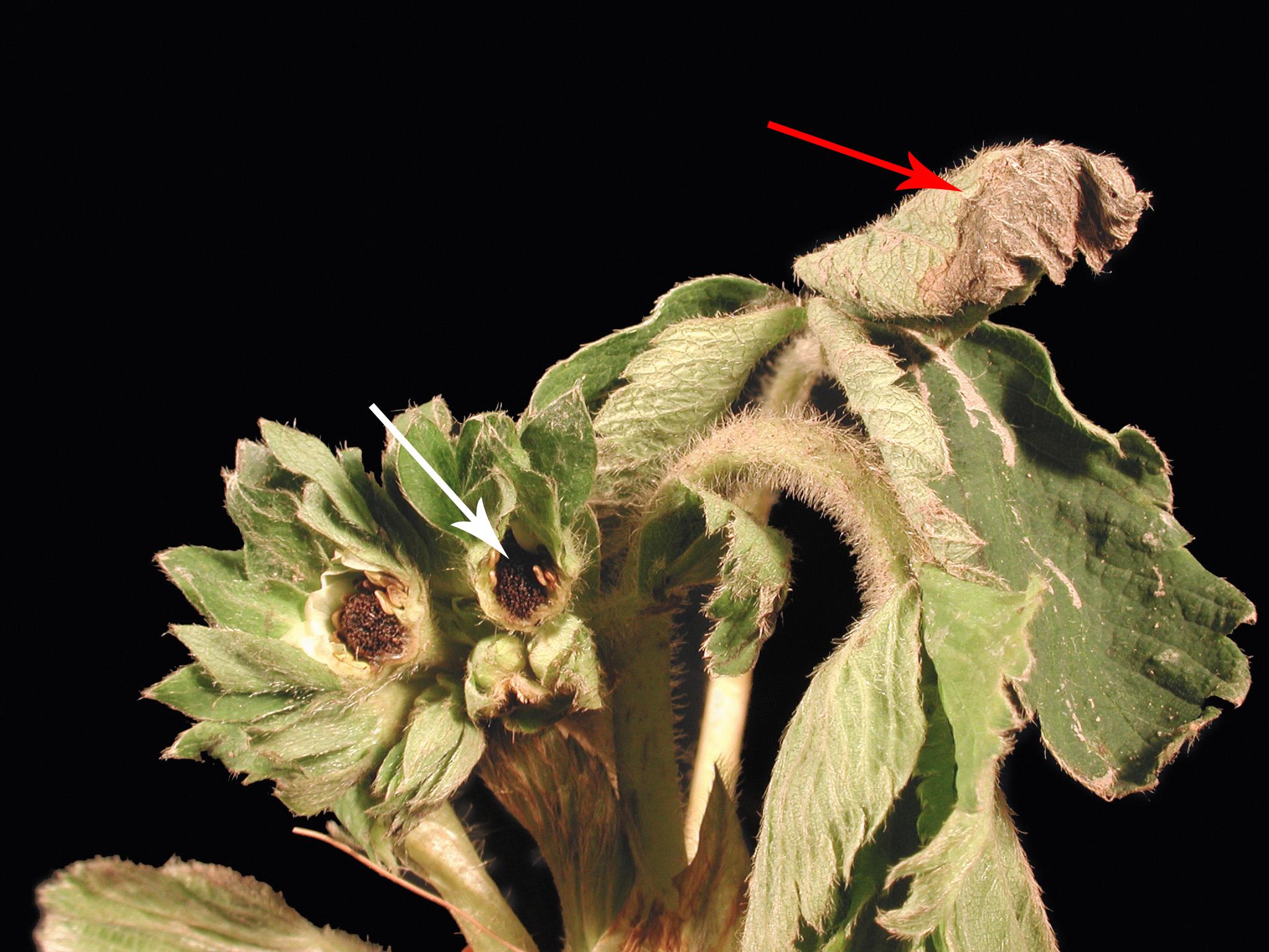 Sur un plant de fraisier (cv 'Honeoye'), tous les pistils et la majorité des étamines sont bruns (voir flèche blanche). Le centre des fleurs est noirci et brûlé. L’apex d’une foliole est bruni et brûlé (voir flèche rouge) et les feuilles sont courbées vers le bas. Les dommages sont causés par un gel printanier. Toutes les fleurs ont gelé.