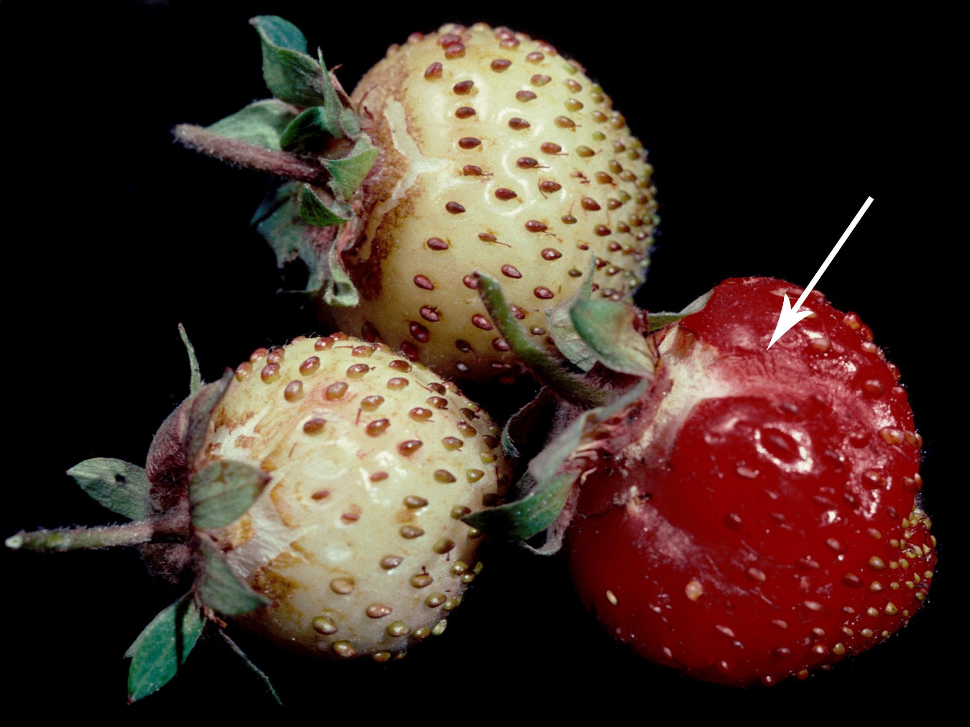 Sur les fraises matures ou non (cv 'Bounty'), présence d’un fin fendillement de l’épiderme au niveau du calice (voir flèche). Ce fendillement est causé par une montée subite de l’eau dans les plants ce qui a fait éclater l’épiderme des fruits.