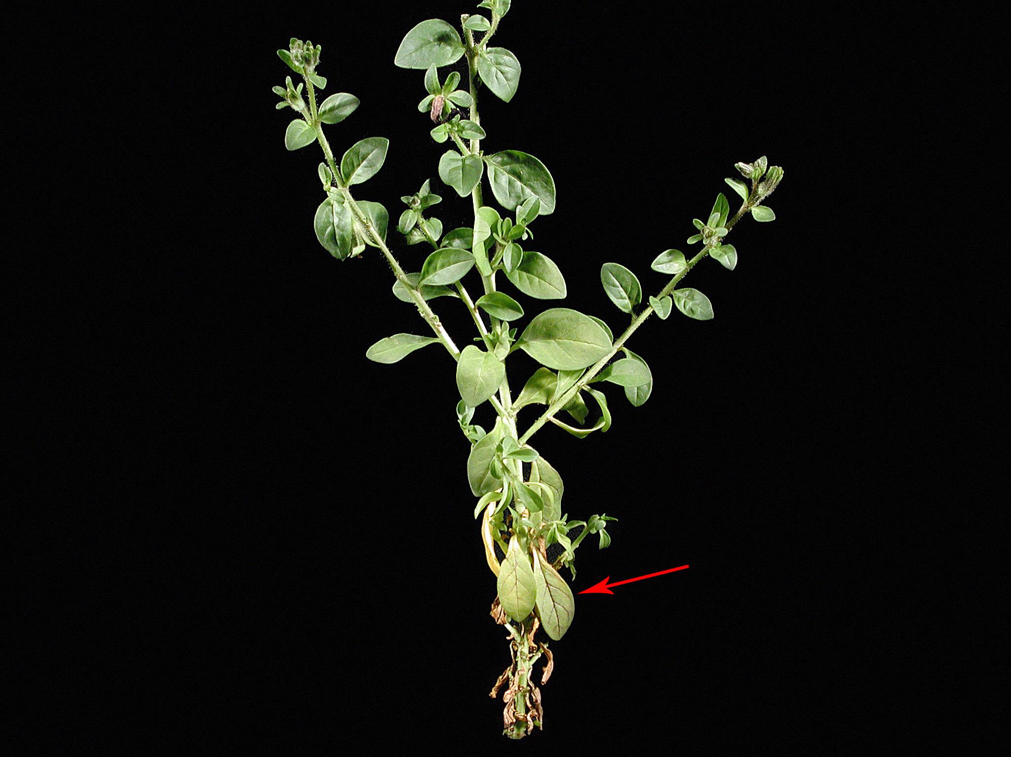 Un plant de calibrachoa montre des feuilles basales complètement dépéries, brûlées et sèches. Les feuilles médianes sont vert pâle à jaunes avec des nervures mauves (voir flèche). Tous les tests de laboratoire se sont avérés négatifs pour la détection de virus, de champignons et de nématodes. Par contre, le pH du substrat est élevé (7,4) tandis que la conductivité électrique est faible (0,6 mS/cm). Le calibrachoa demande un pH se situant entre 5,4 et 6,2 tandis que la conductivité électrique doit se situer entre 2,0 et 3,5 mS/cm.