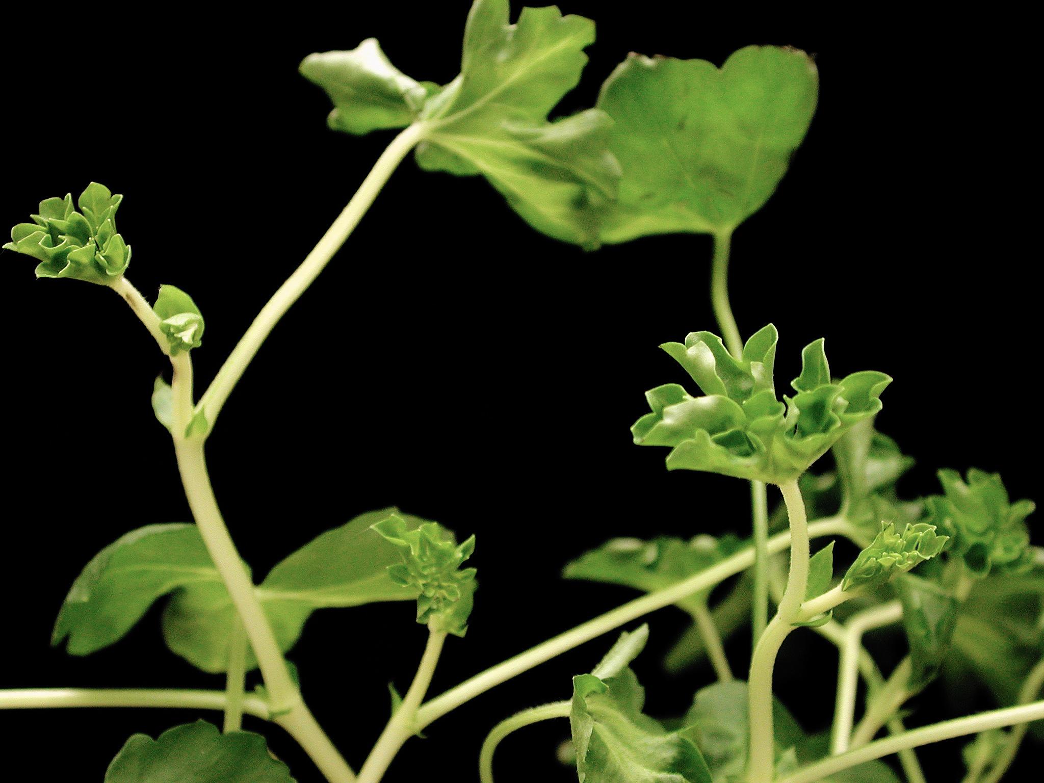 Les jeunes feuilles de plantules de géranium (cv 'Decora Rouge') ont un repli important de la marge, ce qui leur confère une apparence de « feuille de persil ». Certaines feuilles plus âgées présentent un jaunissement du limbe. Dans le plateau multicellulaire, les plantules avaient peu de racines par rapport à la surface foliaire (non visible ici). Les tests de laboratoire se sont avérés négatifs pour la détection de champignons racinaires et l’analyse du substrat est adéquate.