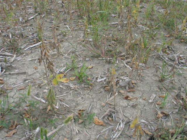 Dans un champ de soya, les plants sont clairsemés et leur croissance est réduite. Certains plants sont dépéris et desséchés tandis que d’autres montrent un jaunissement du feuillage. Ce semis a été fait sur un sol compacté et le taux de germination des semences est relativement faible.