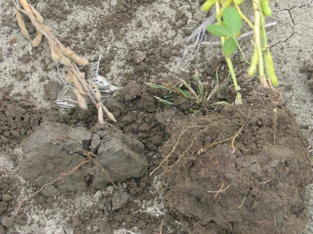 Comparaison entre des plants de soya qui ont poussé dans un sol compacté (à gauche) et moins compacté. Le plant de gauche est dépéri, desséché avec un système racinaire restreint et des racines brunes. Les plants de droite ont une meilleure croissance malgré qu’ils commencent à jaunir. Les racines sont également mieux développées et blanches.