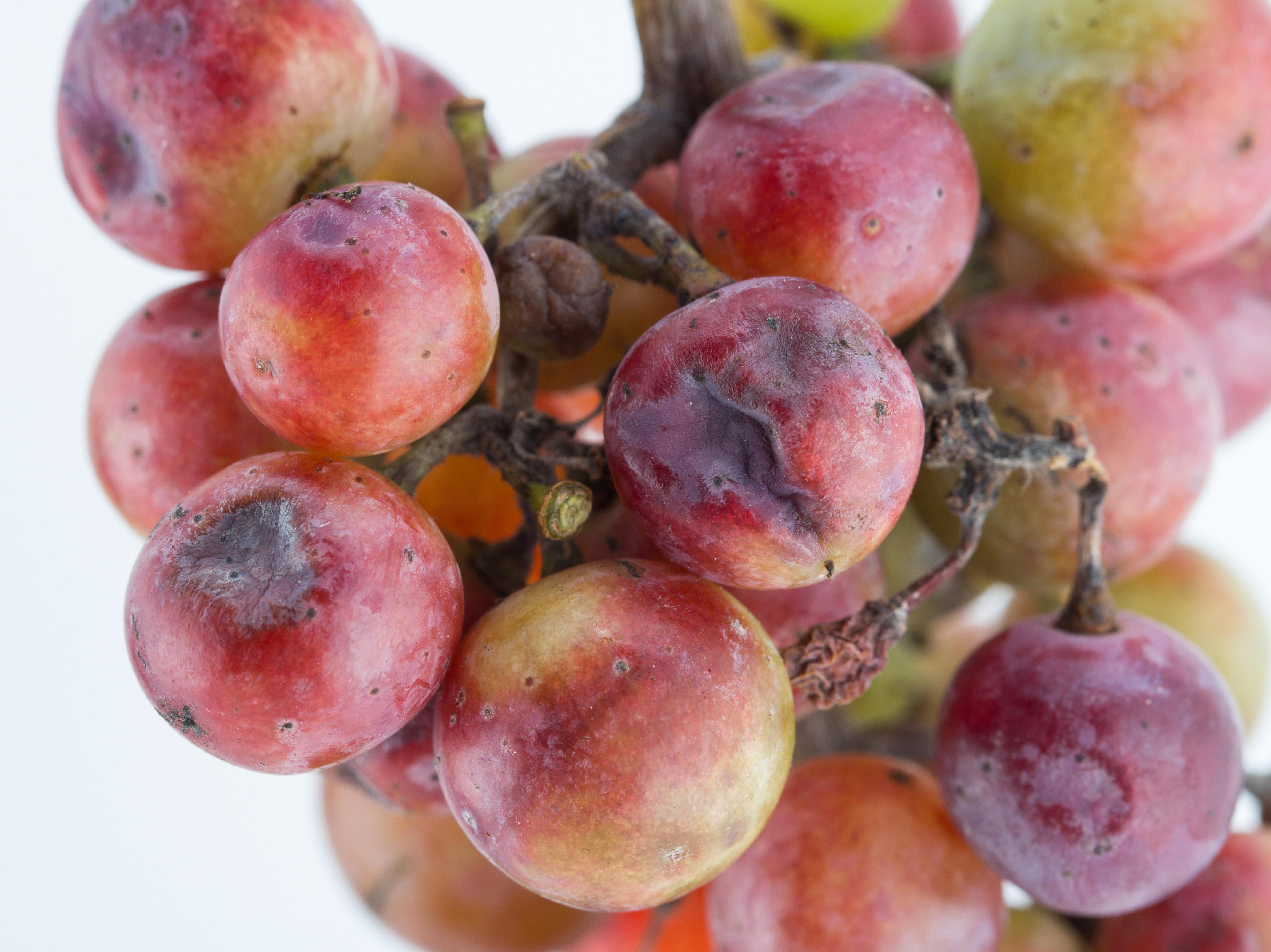 Sur une vigne (cv 'Somerset'), les raisins sont grisâtres à brunâtres, avec ou sans dépressions, et parfois ratatinés ou fendus. La chair est brune dans les baies affectées (non visible ici). Les symptômes sont sur un seul côté du fruit. Les tests de laboratoire se sont avérés négatifs pour la détection de bactéries et de champignons. Les raisins ont probablement subi de l’insolation. Généralement, les dommages sont présents sur le dessus des fruits ou du côté sud ou sud-ouest des grappes. Une taille, un effeuillage ou un positionnement des tiges exposent au soleil des tissus qui étaient plus à l’ombre et qui ne sont pas acclimatés au soleil.