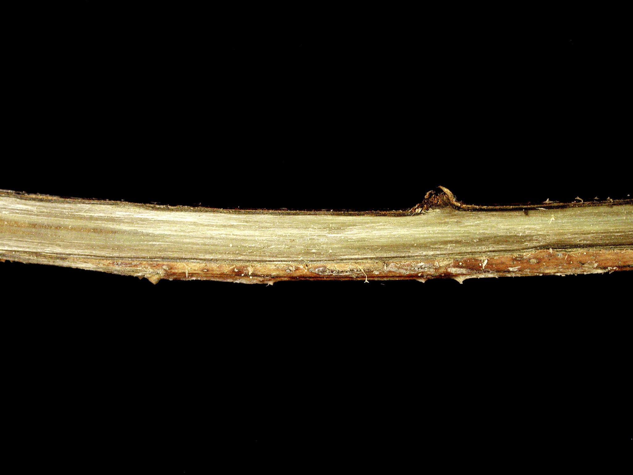 Le système vasculaire d’une tige fructifère de framboisier est brunâtre. Les bourgeons foliaires, les jeunes feuilles et l’épiderme de la tige sont bruns et secs tandis que le pivot racinaire est brunâtre et pourri et les racines sont fines et brunâtres (non visible ici). Seules les tiges annuelles ont amorcé leur croissance au printemps. Selon le conseiller agricole, presque tous les framboisiers présentaient ces symptômes. Cette framboisière a subi du gel hivernal.