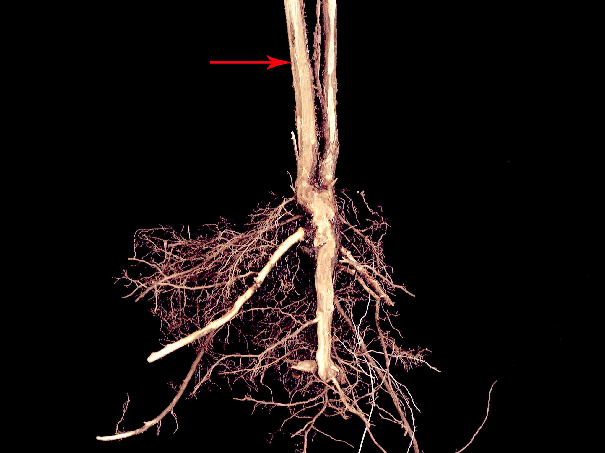 Le pivot racinaire d’un framboisier est brunâtre et pourri et les racines sont fines et brunâtres. Au bas de la tige fructifère, on aperçoit le brunissement du système vasculaire (voir flèche). Les bourgeons foliaires, les jeunes feuilles et l’épiderme de la tige sont bruns et secs (non visible ici). Seules les tiges annuelles ont amorcé leur croissance au printemps. Selon le conseiller agricole, presque tous les framboisiers présentaient ces symptômes. Cette framboisière a subi du gel hivernal.