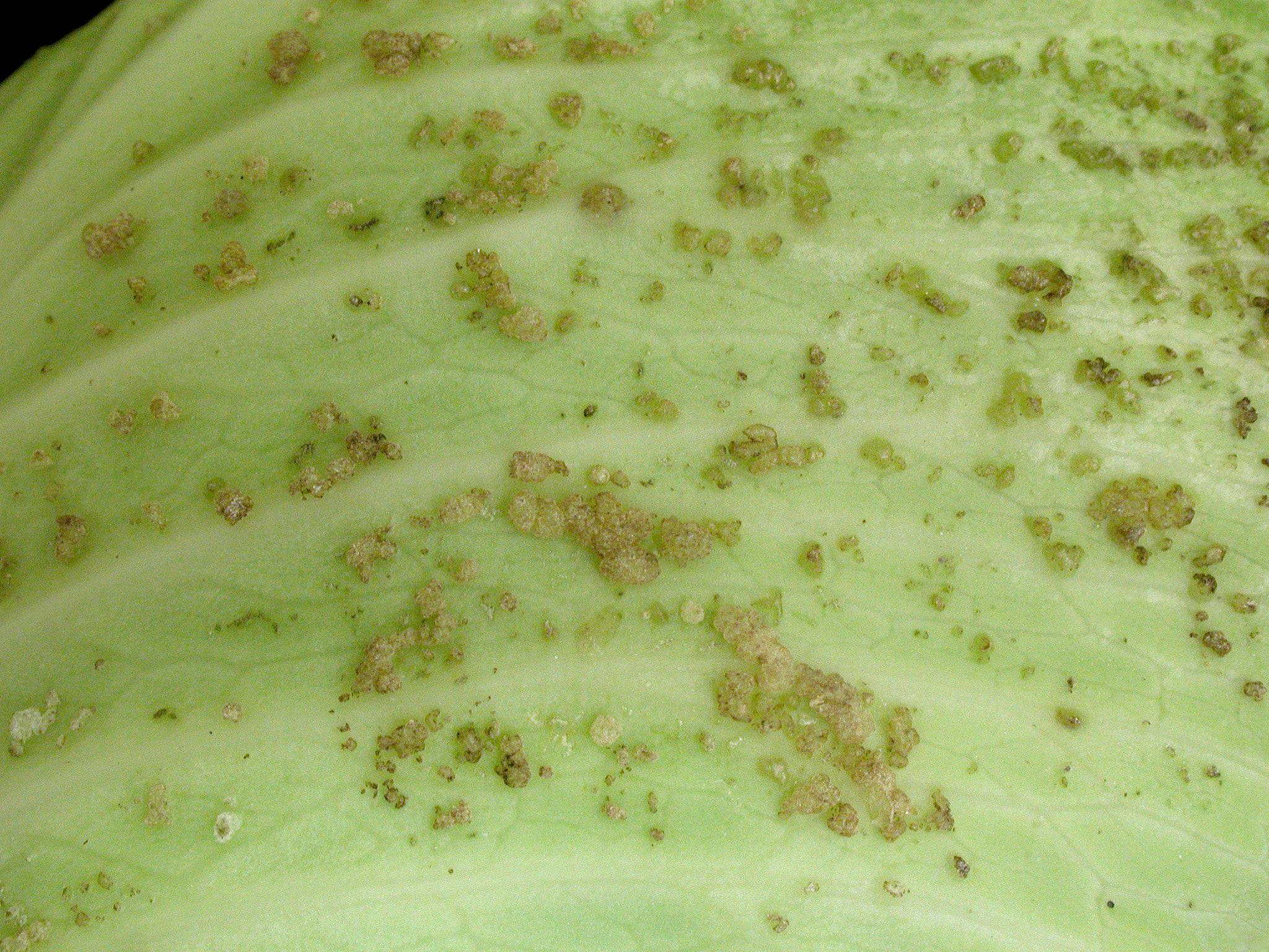 Protubérances liégeuses beiges sur feuille de chou pommé