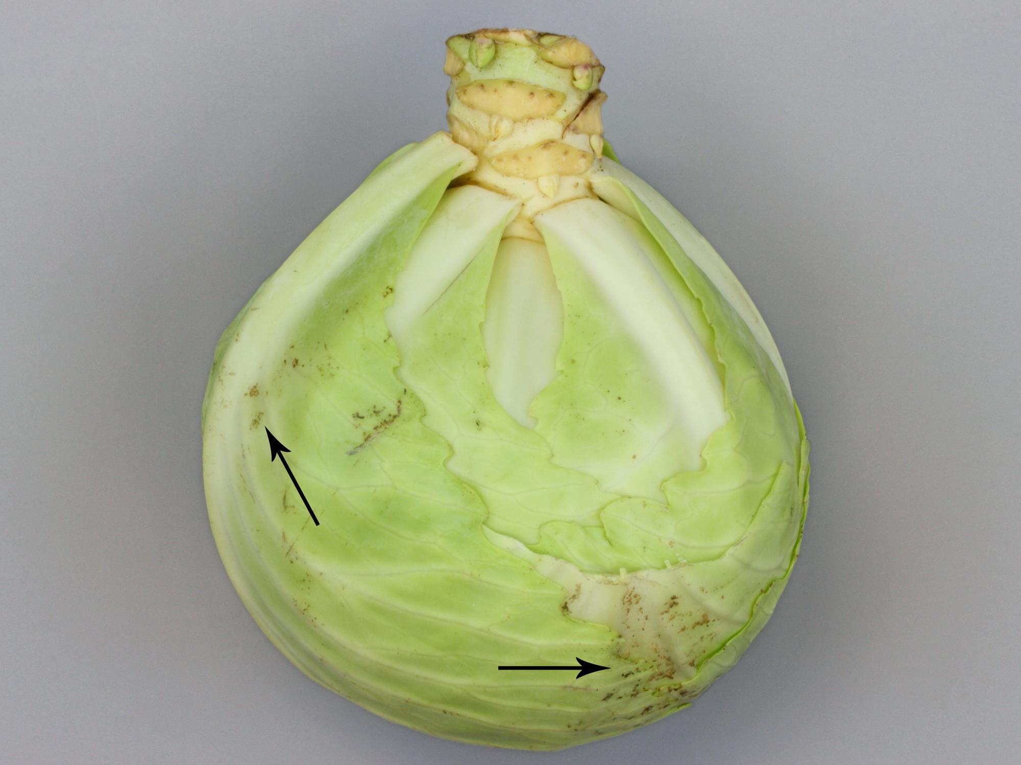À la face supérieure des feuilles basales et enveloppantes d’un chou pommé (cv 'Bartolo'), présence de taches vitreuses, surmontées de protubérances liégeuses et brunâtres, à différents endroits sur le limbe (voir flèches). Aucun agent pathogène n’a été détecté des dommages. Quelques thrips de l'oignon (Thrips tabaci) ont été observés, mais en quantité insuffisante pour expliquer les dommages. Le résultat des tests de laboratoire, la nature des dommages et la forte proportion de plants affectés au champ (90 %) confirment la présence d'œdème sur les feuilles.
