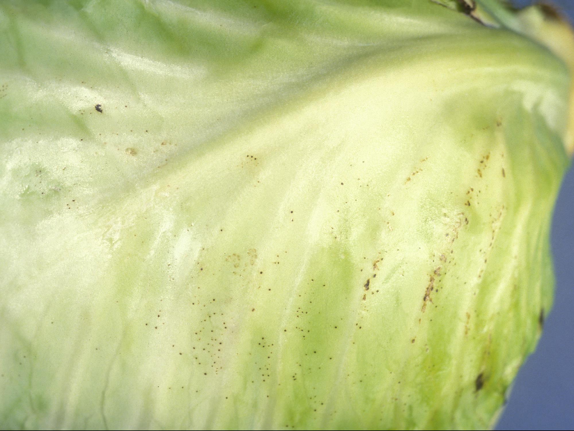 Sur une feuille enveloppante d’un chou pommé (cv 'Bartolo') provenant d’un entrepôt, présence de fines taches noires superficielles sur le limbe et les nervures. Les dommages débutent à la base du limbe et progressent par la suite sur tout le limbe. Le regroupement de minuscules taches noires est caractéristique d’un désordre physiologique connu sous le nom de moucheture noire ("pepper spot").