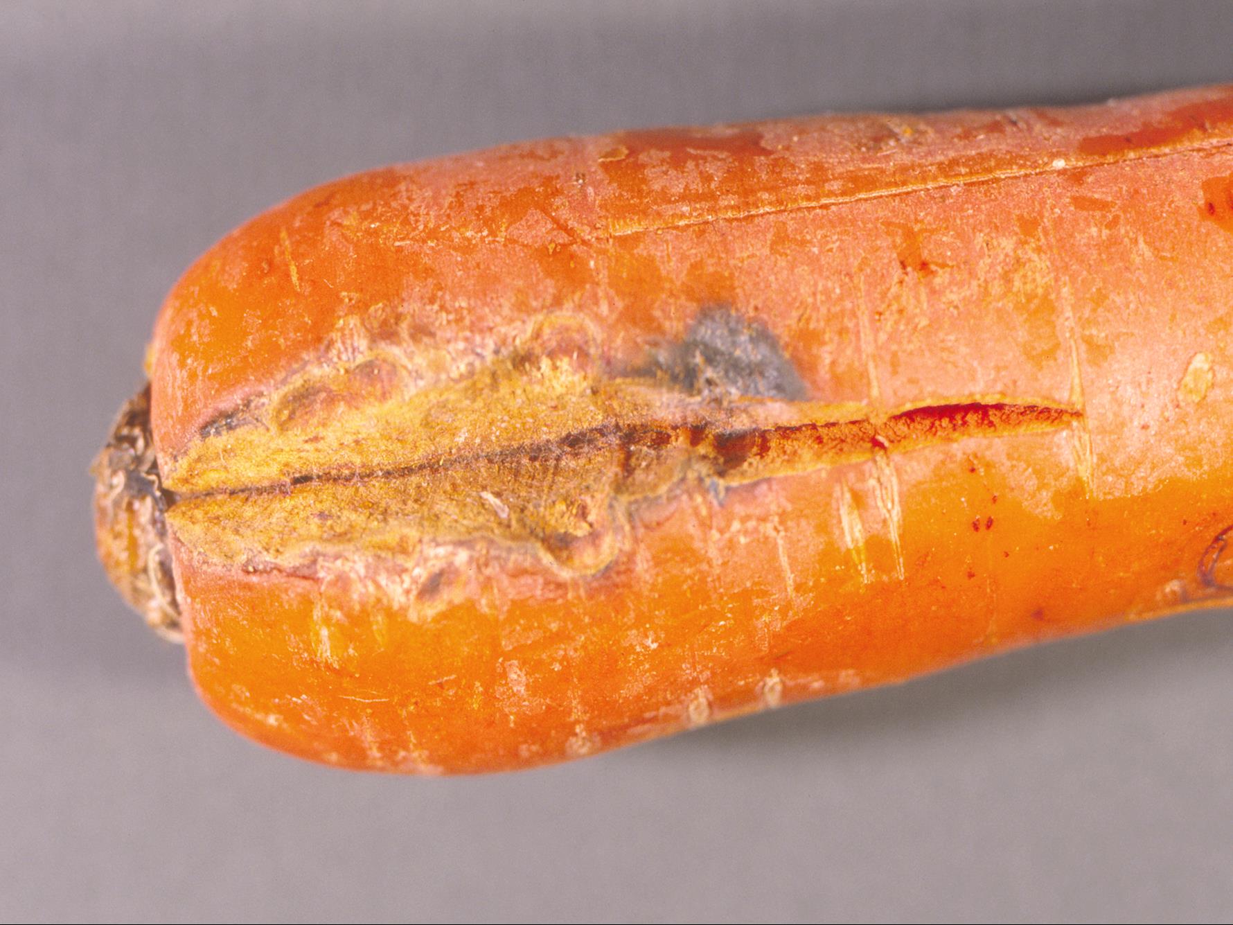 Lors des premières récoltes au champ, présence d’une courte fente longitudinale dans la partie supérieure d’une carotte, près du collet. La chair autour de la fente est subérisée. Il y a absence de pourriture ou de dommages d’insectes. La fente est causée par des variations de l’humidité du sol imputable à une sécheresse qui est survenue au cours de la saison de production.