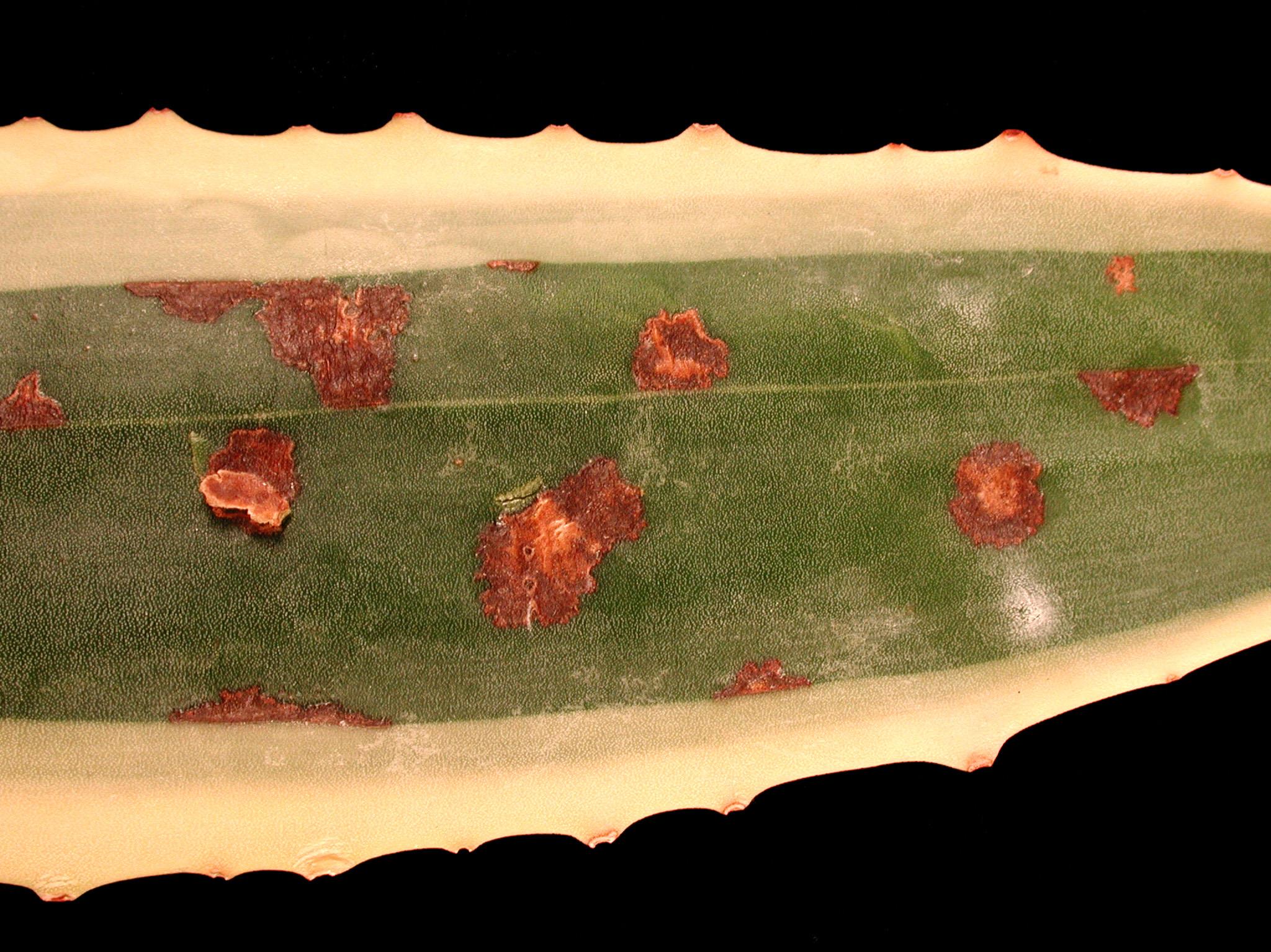 En serre, l’extrémité d’une feuille d’agave d’Amérique (cv 'Marginata') présente des protubérances liégeuses, superficielles et brunes. Elles sont circulaires ou à contour irrégulier. Les protubérances sont présentes à la face supérieure et uniquement dans la partie verte de la feuille. Les symptômes sont caractéristiques de l’œdème.