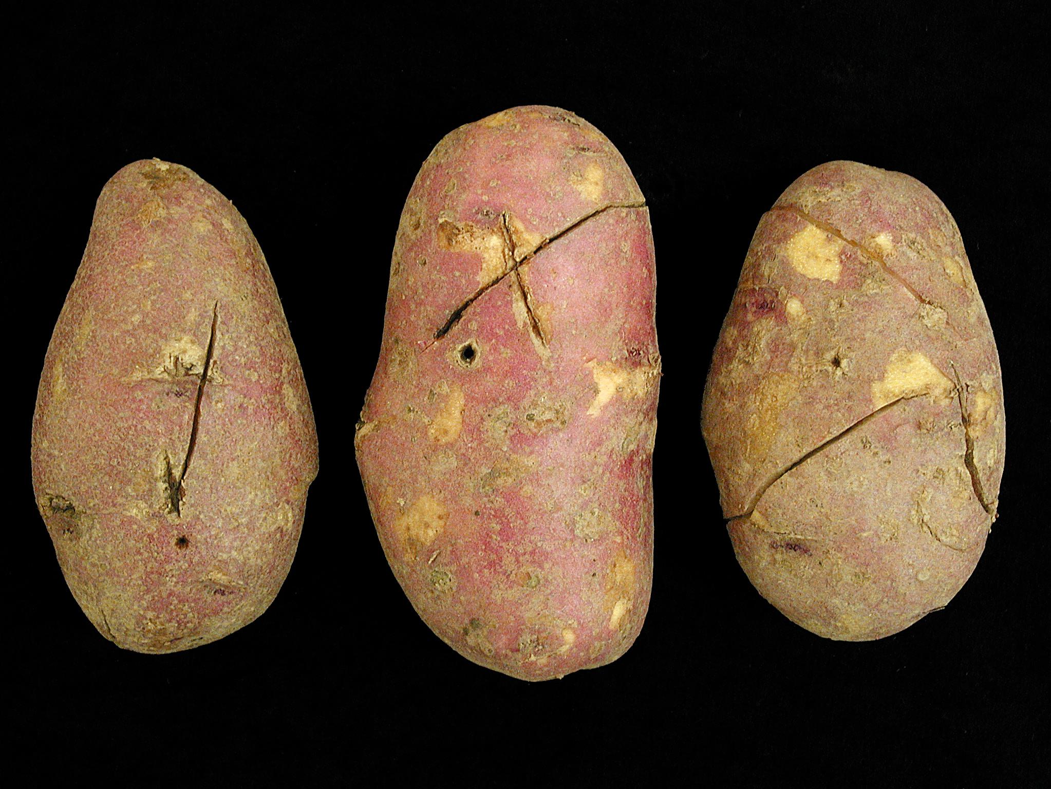 Des tubercules de pomme de terre (cv 'Bijou rouge') provenant d’un champ montrent quelques fentes de différentes longueurs et profondeurs sur le périderme. Les fentes sont très nettes et ne sont pas cicatrisées. Ces malformations sont apparues lors de la récolte et sont connues comme des blessures mécaniques liées aux opérations de récolte, aux conditions climatiques et à l’état des tubercules (turgescence, maturité).