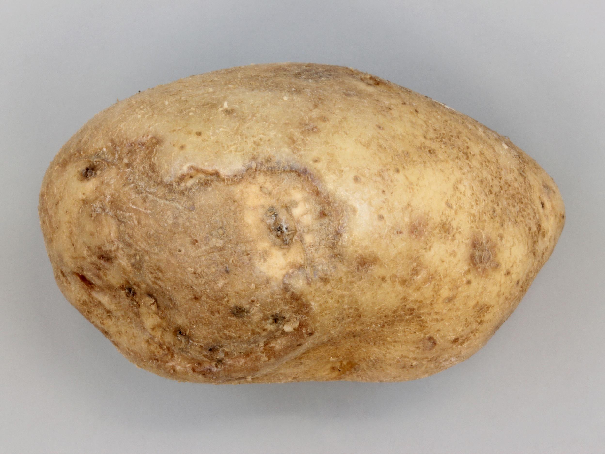 Le périderme d’un tubercule de pomme de terre (cv 'Goldrush') provenant d’un entrepôt montre une large zone foncée et déprimée, d’une forme irrégulière, dans la région du talon. Sous ces zones, la chair est brune sur quelques millimètres de profondeur et l’anneau vasculaire est noir dans la zone affectée (non visible ici). Aucun agent pathogène n’a été détecté des tubercules. Ces symptômes sont causés par du gel en entrepôt (température basse de l’air).