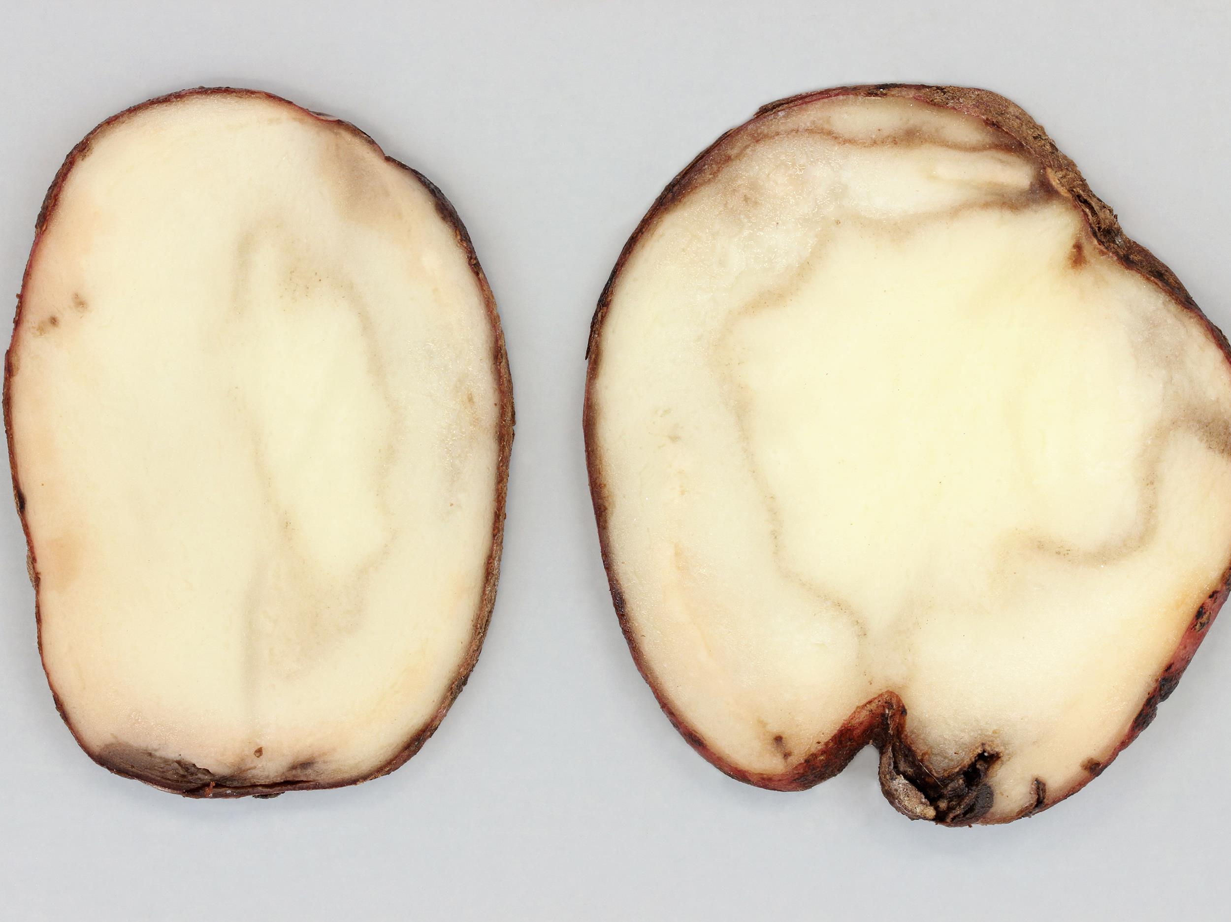 Des tubercules de pomme de terre provenant d’un entrepôt montrent un noircissement discontinu du système vasculaire, une coloration beige à rosée de la chair sauf dans la moelle et un brunissement en petites zones dans le cortex. Aucun agent pathogène n’a été détecté dans la chair des tubercules. Le périderme était uniformément craquelé, liégeux et brun. Les symptômes ont probablement été causés par du gel en entrepôt (température basse de l’air).