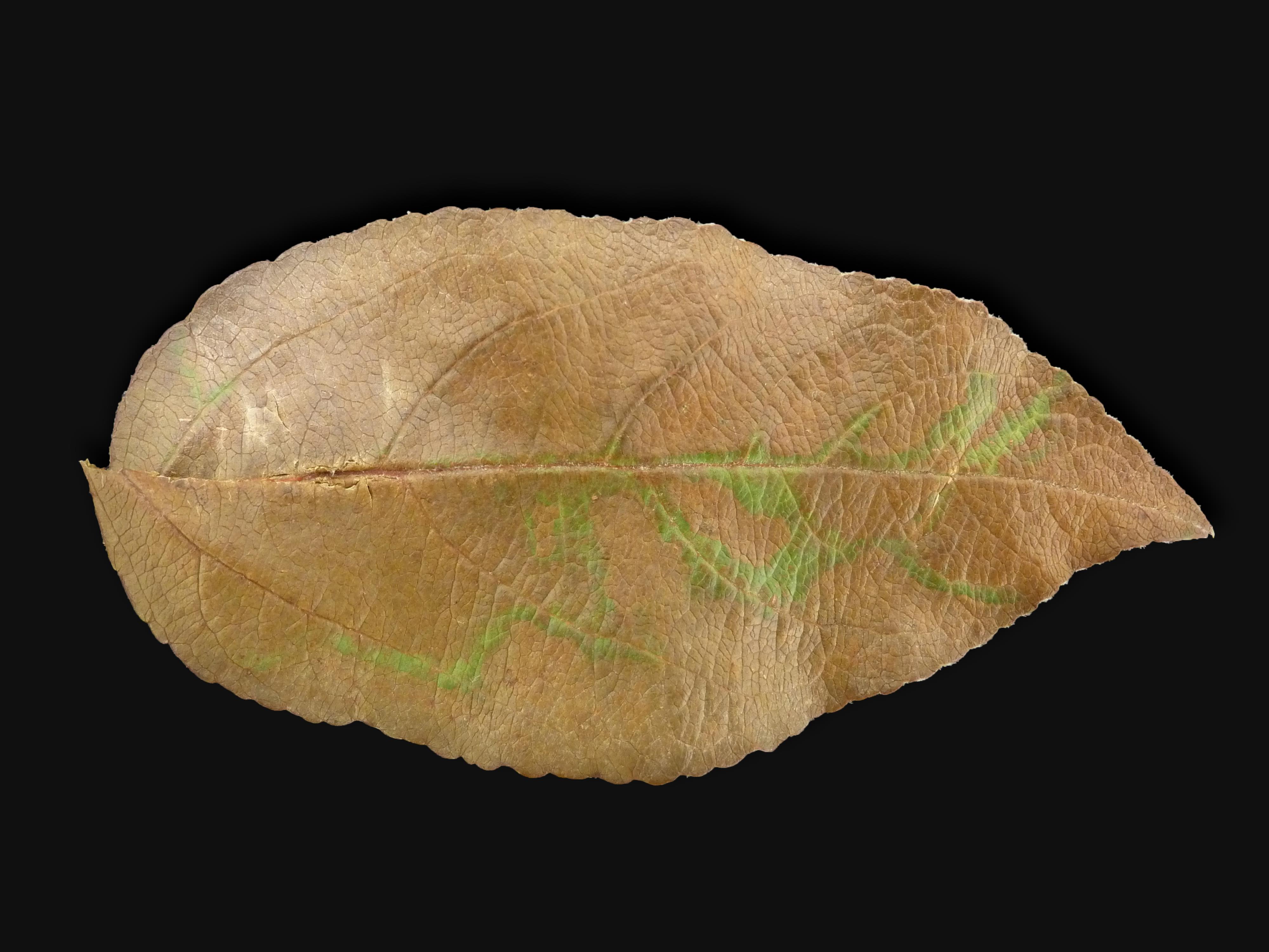 Une feuille de pommier montre un brunissement sur presque tout le limbe. Seules quelques nervures sont vertes. L’analyse de la teneur en éléments minéraux des feuilles a révélé une teneur en magnésium (Mg) de 0,0951 % (951 mg/kg ou ppm). Les résultats d’analyse foliaire révèlent une carence en magnésium. La concentration adéquate de cet élément est de 0,25 à 0,40 %.