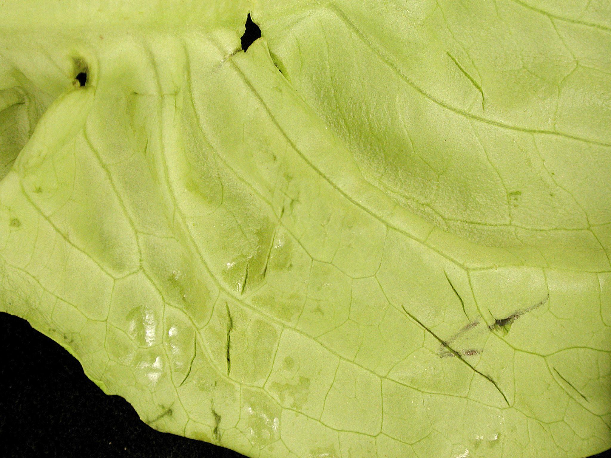 Une vue rapprochée d’une feuille de laitue Boston cultivée en serre montre des zones du limbe vert luisant et un fin picotement brun rouille sur la nervure principale à la face inférieure (non visible ici). Les reflets métalliques sous les feuilles sont typiques d’un dommage par le gel. Les observations microscopiques ont révélé des dommages sur les glandes foliaires. Il est possible que les basses températures de l’air aient endommagé les glandes ce qui a enclenché par la suite des réactions enzymatiques de type phénolique, produisant des substances de couleur foncée.