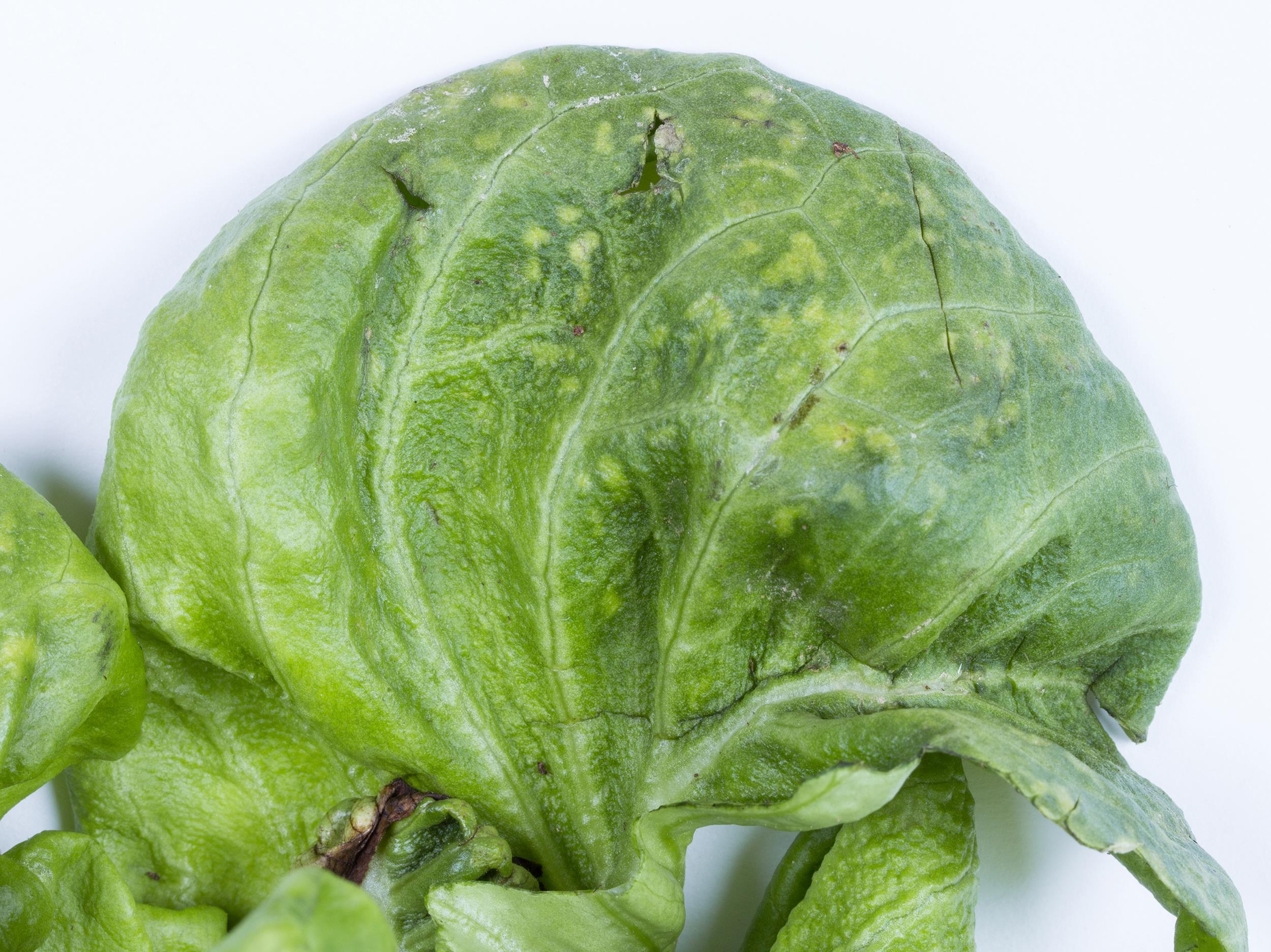 Une laitue Boston (cv 'Flandria') montre une malformation sévère des feuilles. Une vue rapprochée des feuilles médianes et de la couronne montrent une marbrure jaune entre les nervures près de la marge du limbe. Les feuilles sont enroulées vers l’extérieur, épaisses, craquantes. Les nervures sont parfois blanchâtres. Les feuilles du cœur sont nécrosées et la croissance du bourgeon terminal est inhibée (peu visible ici). Les tests de laboratoire se sont avérés négatifs pour la détection de phytoplasme et de virus. Le champignon Olpidium sp. n’a pas été détecté des racines (virus des grosses nervures (MLBVV)). Les symptômes sont caractéristiques d’une carence en bore. Il est également possible que le MLBVV soit impliqué dans les symptômes (nervures jaunes) mais le vecteur n’a pas été observé dans les racines et nous ne possédons pas l’anticorps pour détecter ce virus.