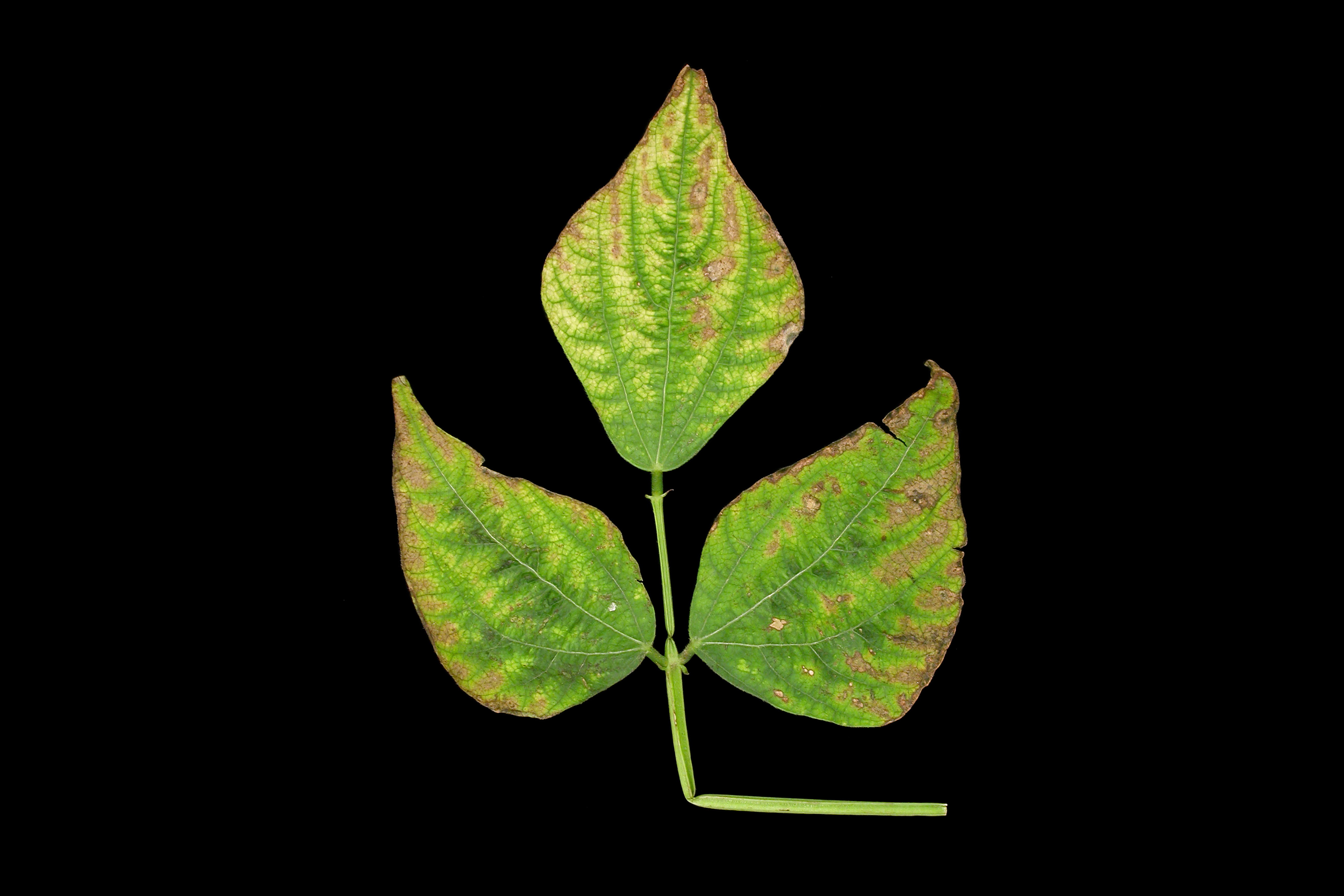 Une feuille trifoliées de haricot (cv 'Hawaï') montre des brûlures entre les nervures et à la marge des folioles. Un jaunissement progresse également entre les nervures. Aucune bactérie n’a été détectée des dommages. Ces symptômes s’apparentent à une carence en potassium chez le haricot.