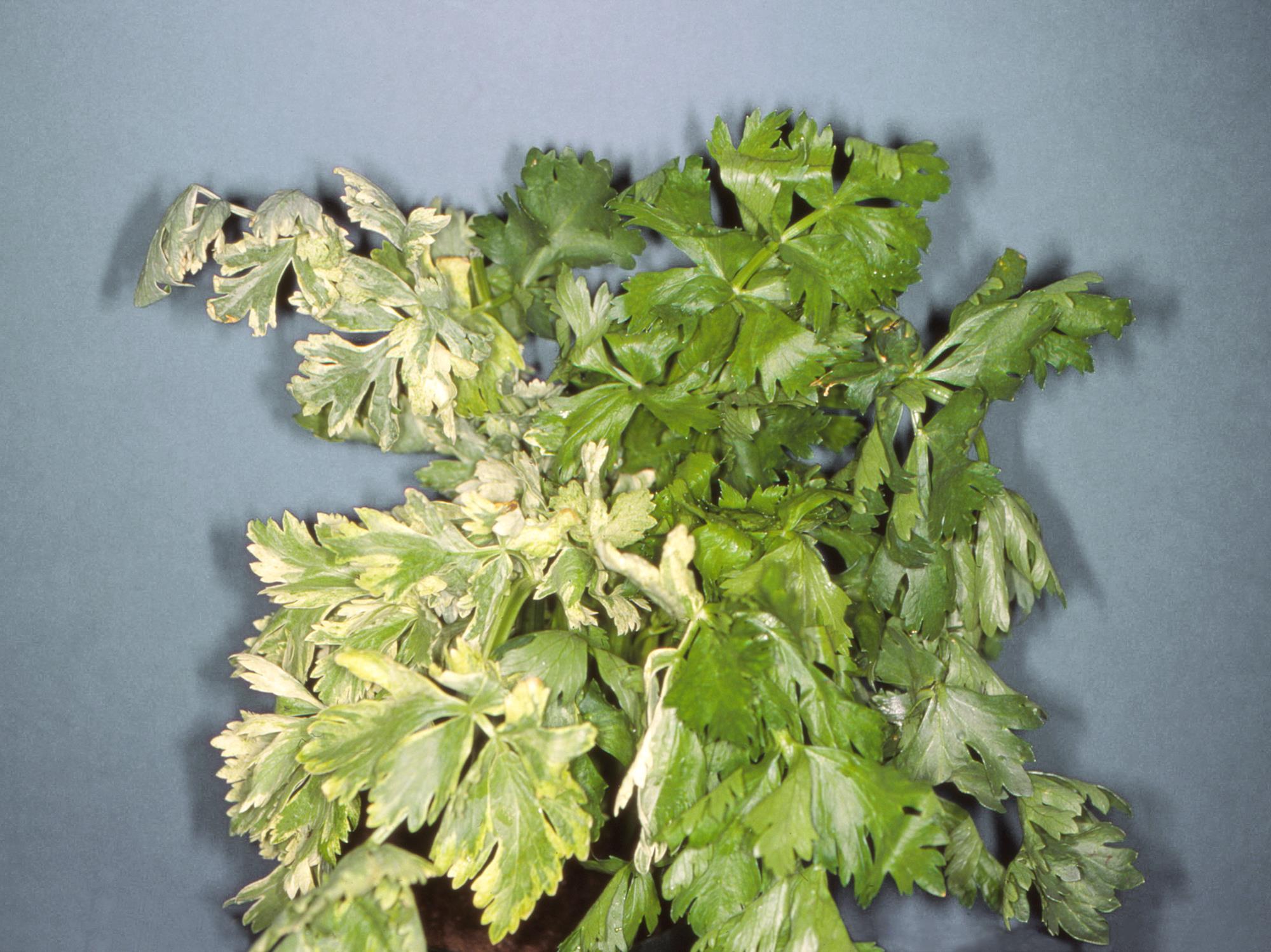 Un plant de céleri (cv 'Utha') montre une anomalie de coloration sur les feuilles qui se caractérise par un blanchiment de la marge et une mosaïque blanche. Les feuilles affectées sont toutes situées sur le même côté du plant. Les pétioles présentaient des lignes blanches. Les tests de laboratoire se sont avérés négatifs pour la détection de virus. Les anomalies de coloration s’apparentent à une chimère (désordre génétique).